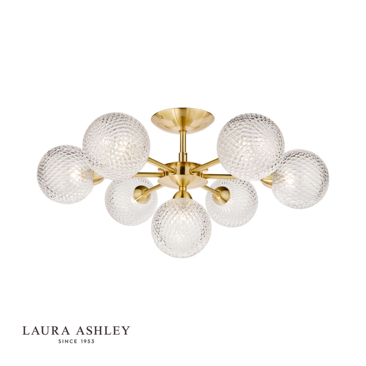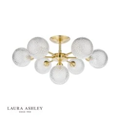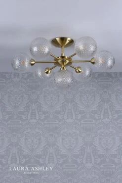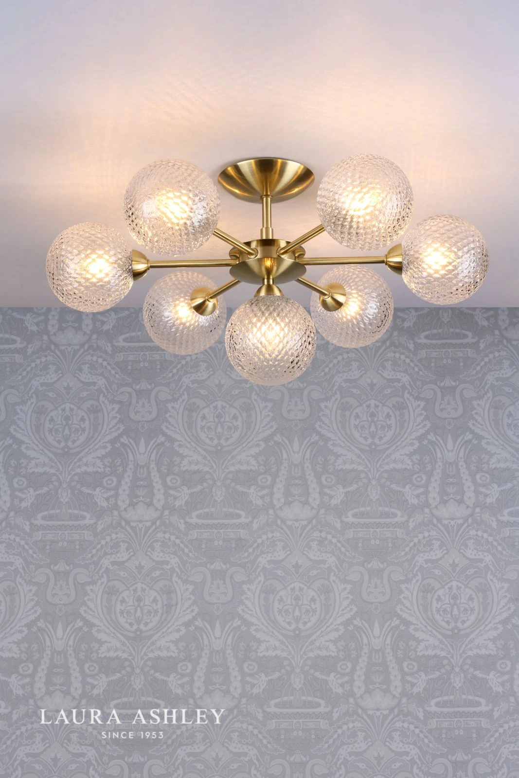With clear textured glass, the globe shades of the elegant Atherton ceiling light from Laura Ashley partially conceal the light bulbs and cast a sparkly light. Featuring a magnificent seven lights, it has a luxurious contemporary look and, with a nod to the Space Age, great mid-century style. As it is a semi-flush light fitting, the stem conceals the cables, giving a neat finish.