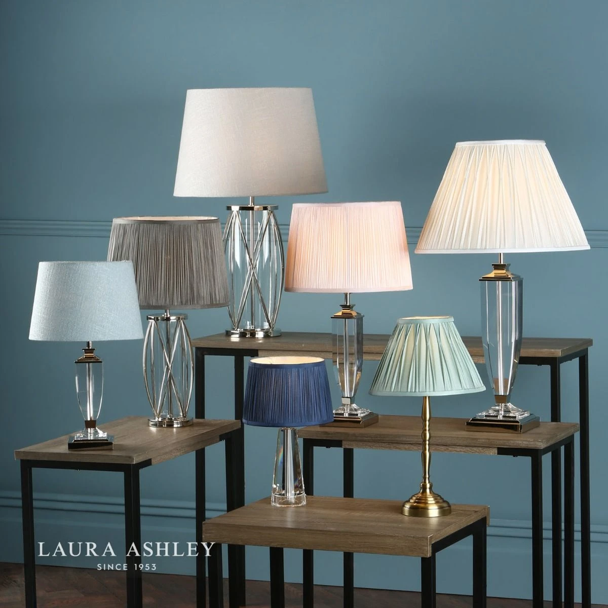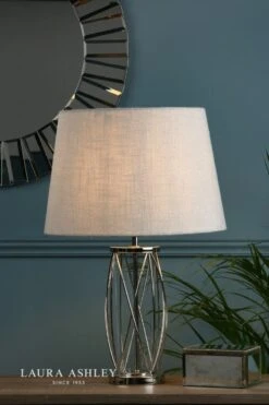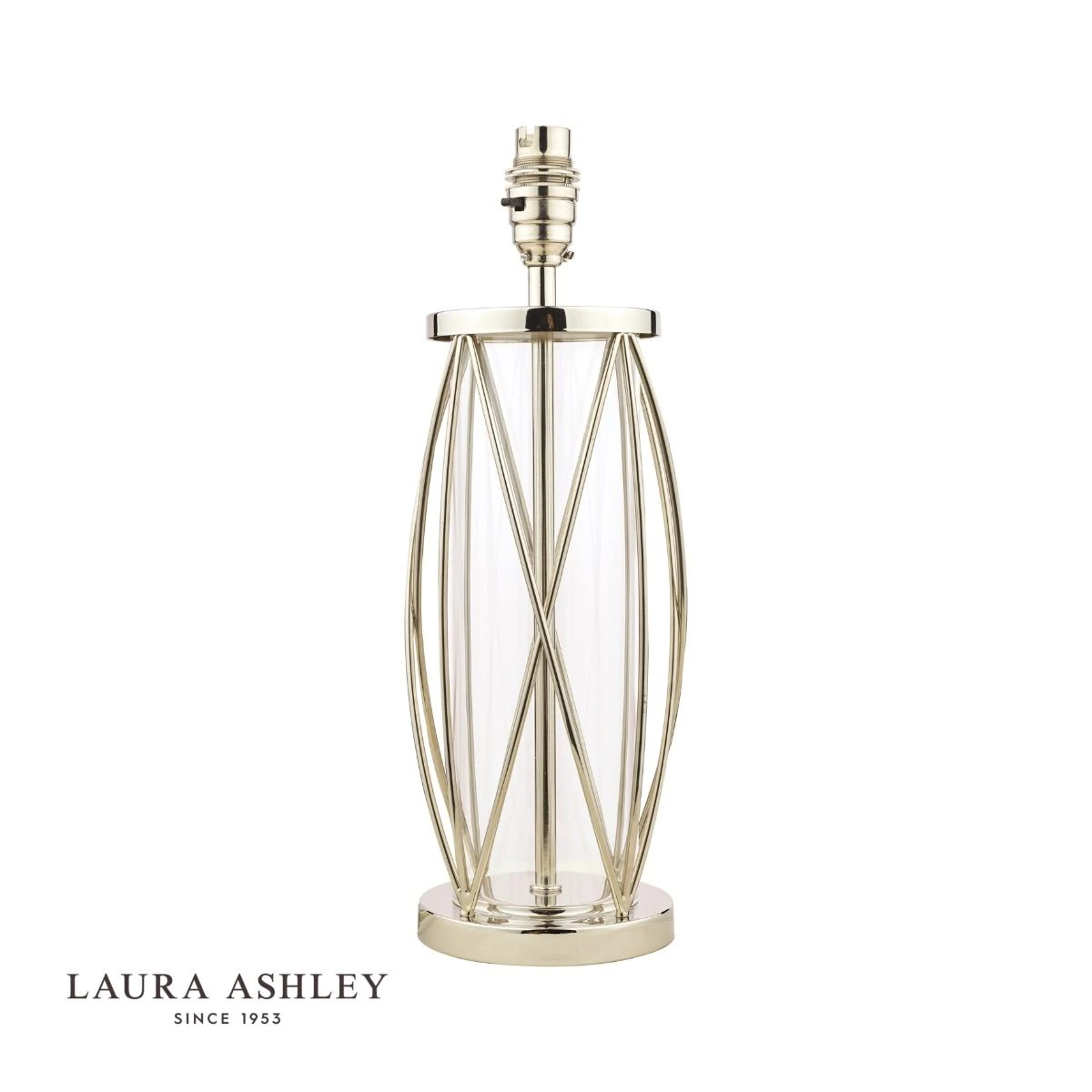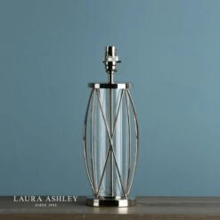 The small Laura Ashley Beckworth table lamp is a modern lamp base in a gorgeous lantern style. A slick, curved lattice in vintage polished nickel encasing a clear glass cylinder gives this table light a contemporary style that enhances any interior theme.