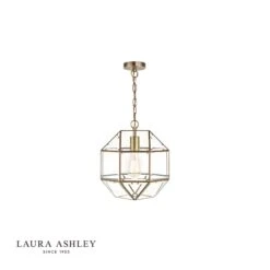 This glazed ceiling pendant lantern-style light from iconic brand Laura Ashley will be a real feature in your hallway or living room. The Blackwell ceiling light comprises small panels of clear glass, the edges of which are encased in thin metal strip, with a warm, antique brass finish, forming a three-dimensional roughly globe shape. The glass is bevelled for a luxurious, quality look. Suspended by a chain, the height of this light can be adjusted when it is installed, to give an overall drop of between 41cm and 137cm. Chain, ceiling rose and twisted braided gold cable are included. Takes 1 x 60W max ES GLS light bulb (not included).