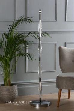 The Laura Ashley Blake floor lamp is a beautifully crafted clear cut crystal floor standing light with a thick glass base from which soars a slender stem encased in four faceted crystal segments. This heavy lamp base will add contemporary glamour to your home.