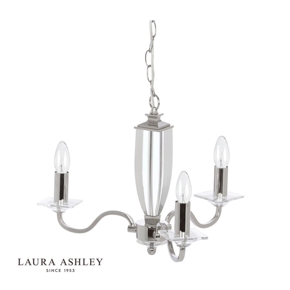 The Carson 3 light bathroom pendant by Laura Ashley is perfect for those who want to make a statement. With elegantly curved arms in polished chrome and adorned with square bobeches that match the striking solid glass stem. IP44 Rated. Requires 3 x G9 bulbs; sold separately. Height adjustable at point of installation.