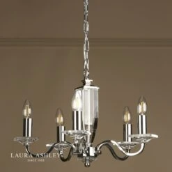 The Laura Ashley Carson 5-armed ceiling fitting is a beautifully crafted, candelabra style chandelier that makes a rather grand statement. Five arms in a vintage polished nickel finish curve out from the column-shaped body. Reminiscent of the shape of a slender classical vase, this centre piece is in clear, cut crystal, hand polished to give a smooth surface. The crystal is also used for the square candle dishes.
