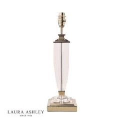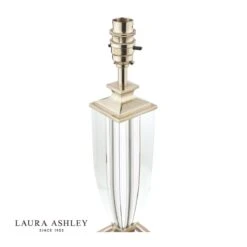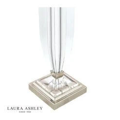 The Laura Ashley Carson table lamp is a rather grand statement table light with a solidity belied by the clear, cut crystal body, hand polished to give a smooth surface. Standing foursquare, the metal base supports the column-shaped body, reminiscent of the shape of a slender classical vase. This handsome table lamp sports a vintage polished nickel finish.