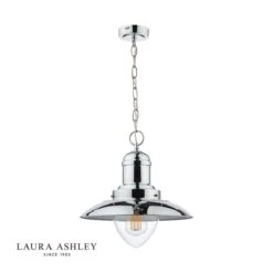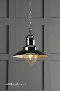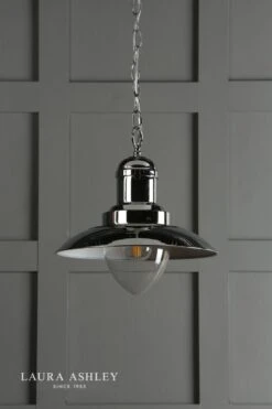This traditional fisherman style Corbridge metal ceiling pendant from Laura Ashley is just the thing to illuminate a dining table or positioned as a trio above a breakfast bar. With a bright, polished chrome finish, this hat-shaped light fitting will bring a smile to your eyes, without causing glare from the side, so you can hang it lower than other lights with more translucent shades.