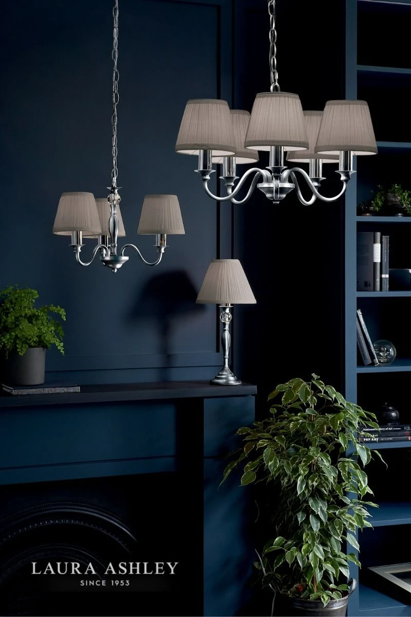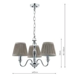 The Laura Ashley Ellis 3-armed ceiling fitting is a beautifully crafted, candelabra style chandelier. Three arms in a bright polished chrome finish flow out from the spindle-shaped body incorporating a pretty faceted glass ball. With a bright, polished chrome finish, this delightful ceiling light comes complete with light grey pleated cotton shades.