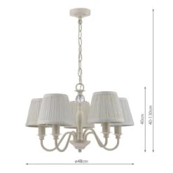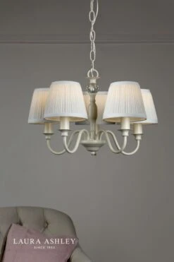 In a sophisticated off white hue, the classically styled Ellis Chandelier from Laura Ashley is a traditional look with a clean finish. Its light colour makes it is versatile enough to work into contemporary or traditional themes with equal ease. This 5-armed ceiling fitting is a beautifully crafted, candelabra style chandelier. Five arms flow out from the spindle-shaped body, which incorporates a pretty faceted glass ball. With a satin-painted finish in cream, this delightful ceiling light comes complete with ivory pleated cotton shades.