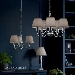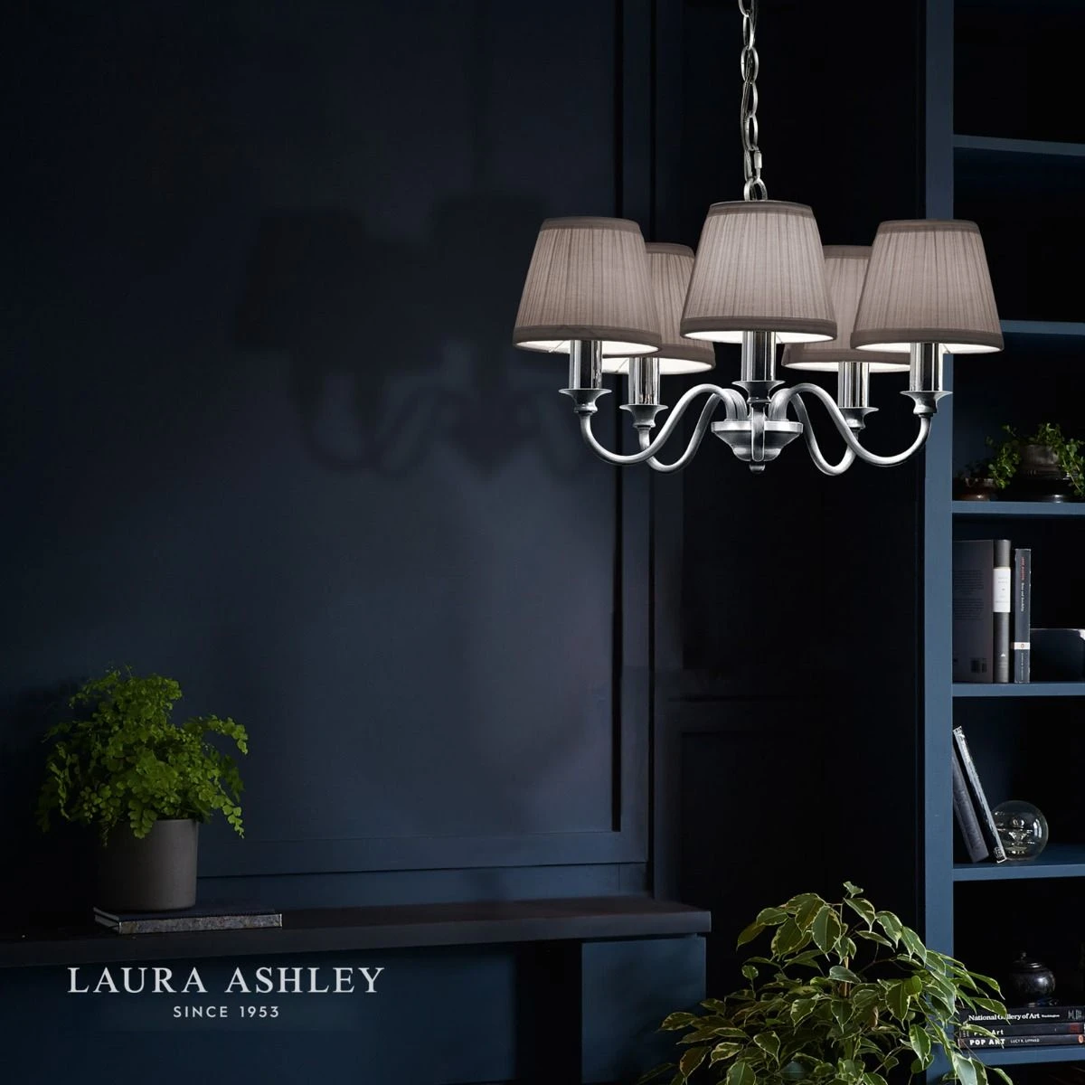 The Laura Ashley Ellis 5-armed ceiling fitting is a beautifully crafted, candelabra style chandelier. Five arms in a bright polished chrome finish flow out from the spindle-shaped body incorporating a pretty faceted glass ball. With a bright, polished chrome finish, this delightful ceiling light comes complete with light grey pleated cotton shades.