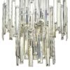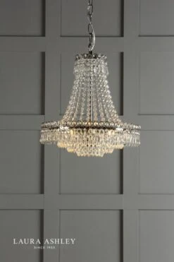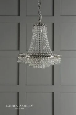 Discover classic elegance with Laura Ashley’s Enid Chandelier. Delicate crystals hang from rings to form this beautiful pendant, an eye-catching centrepiece that is an effortlessly sophisticated lighting option that is always in style. With a cascade of crystal beads flowing downwards and outwards from a narrow circlet to a wider one, from which are suspended cut droplets in ever-decreasing circles, this French-influenced ceiling light is made of clear, cut crystal, hand polished to give a smooth surface, on a metal frame finished with polished chrome.