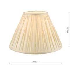 The Laura Ashley Fenn lightshade has a classic, slightly angled, Empire drum form. The diameter of this size is 30cm. Here we finish it in an elegant, pinched pleat smooth silk in ivory.