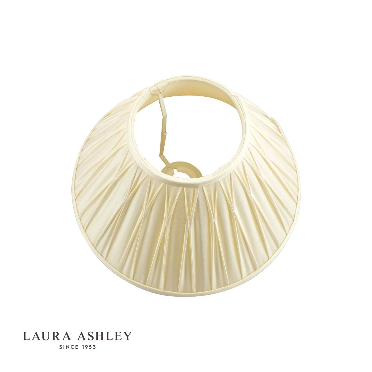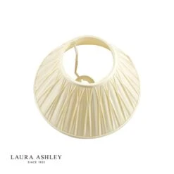 The Laura Ashley Fenn lightshade has a classic, slightly angled, Empire drum form. The diameter of this size is 40cm. Here we finish it in an elegant, pinched pleat smooth silk in ivory.