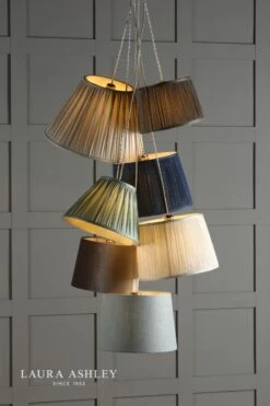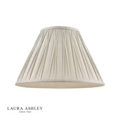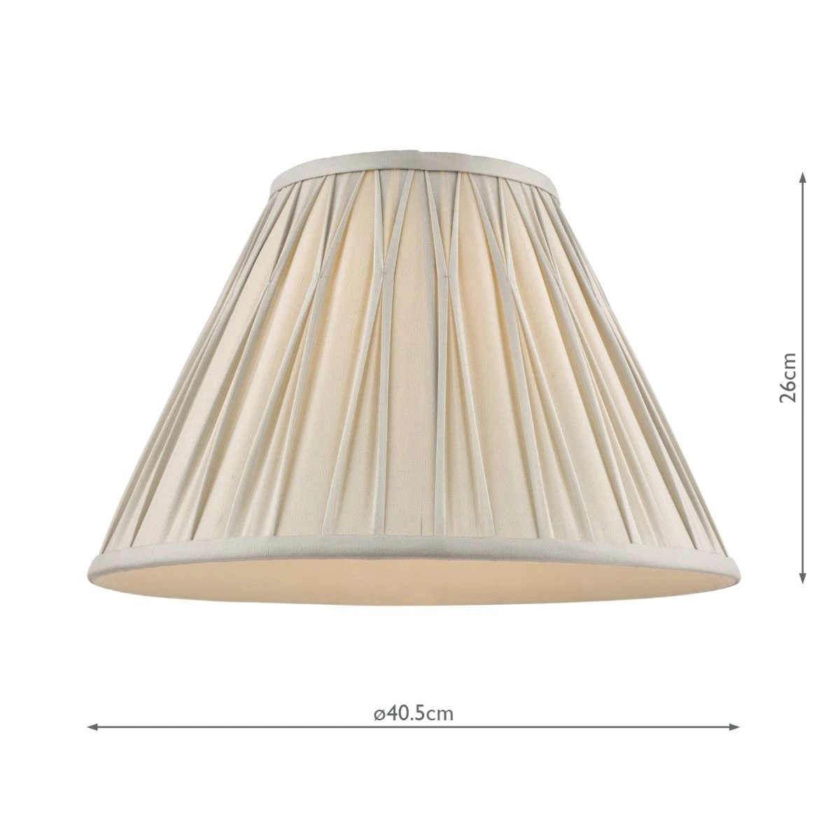 The Laura Ashley Fenn lightshade has a classic, slightly angled, Empire drum form. The diameter of this size is 40cm. Here we finish it in an elegant, pinched pleat smooth silk in silver.