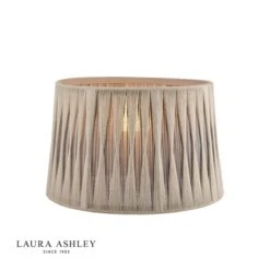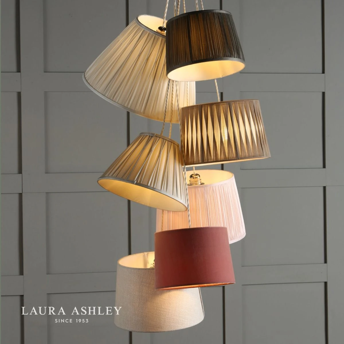Featuring pretty gathered pleats in two layers in versatile tones of grey, this classic lightshade from Laura Ashley has a classic, slightly angled, Empire drum form. The diameter of this size is 35cm. Here we finish it in a smooth cotton pleats. The outer pleats – in charcoal – are pinched together in sections with light grey thread, revealing the lighter grey, softly pleated lining beneath.