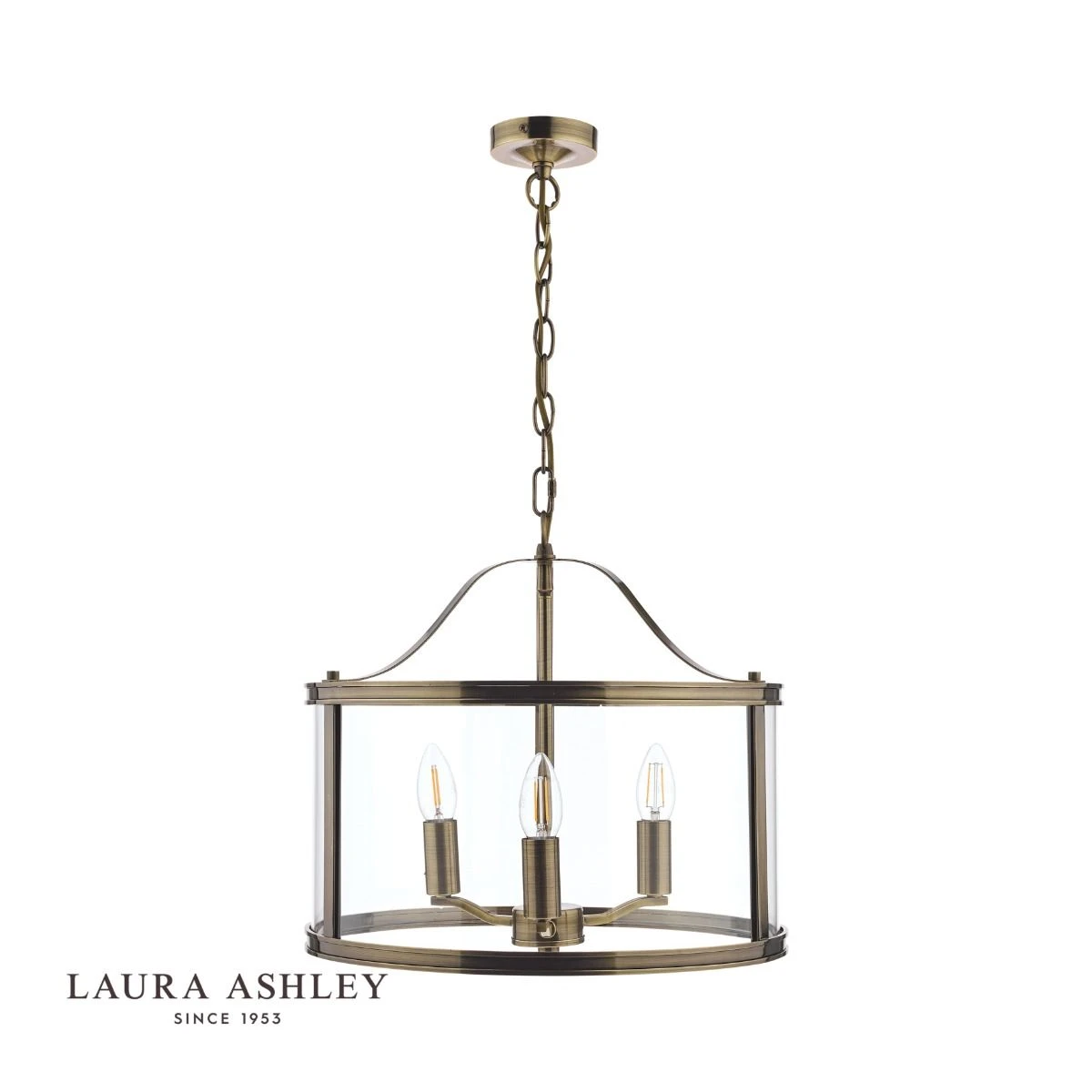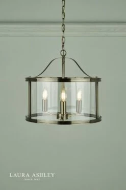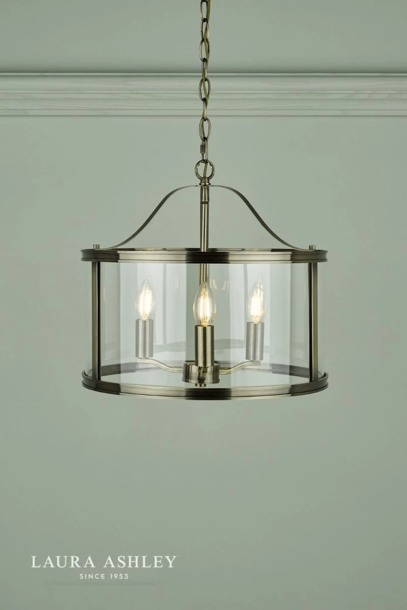 The clean-lined Laura Ashley Harrington ceiling pendant light is a graceful blend of clear glass and sleek metal. A simple, lantern-style drum-shaped case surrounds a suspended trio of lampholders, all in a warm antique brass finish for effortlessly elegant looks. The 3 light Harrington ceiling pendant is a subtle yet stylish piece to illuminate your favourite room and create a bright, inviting space.