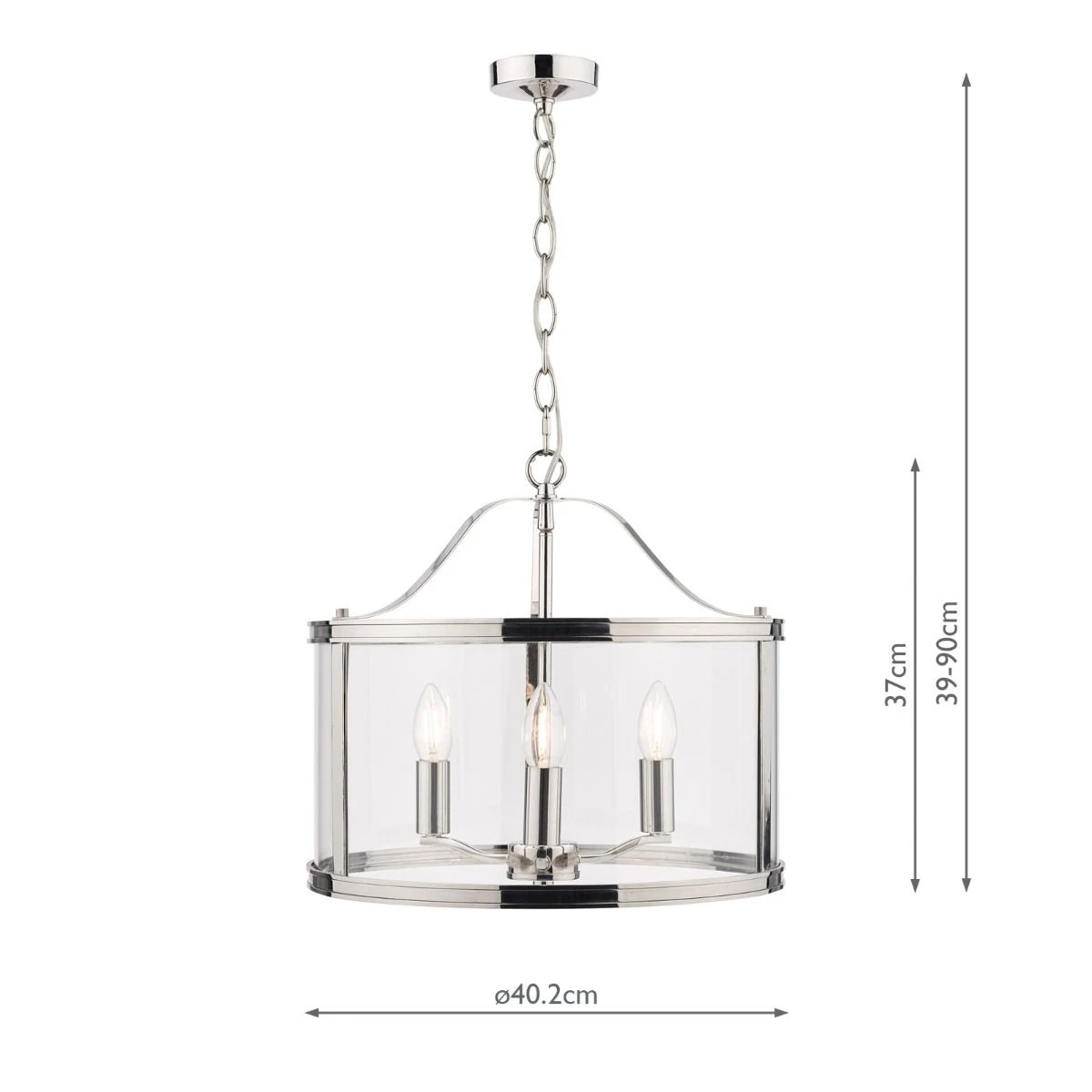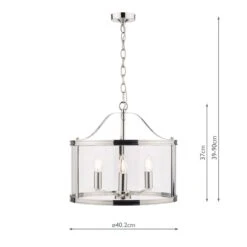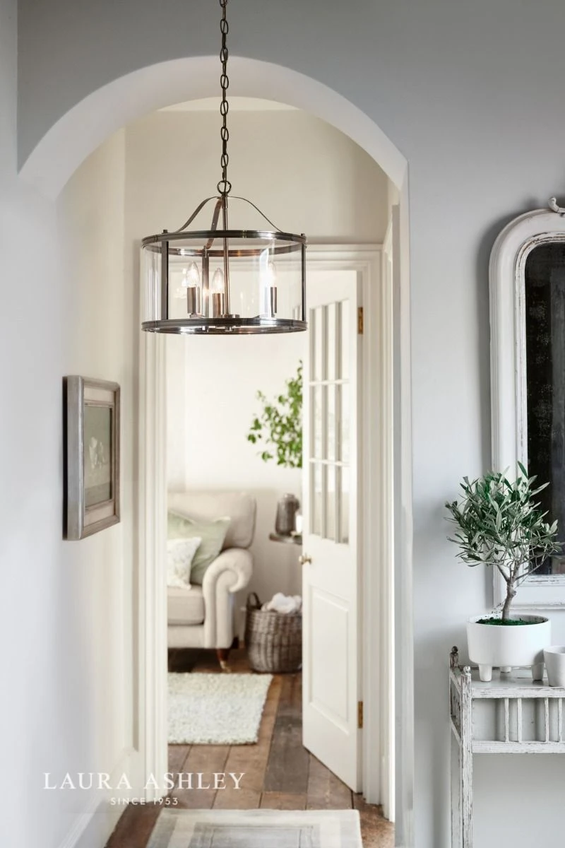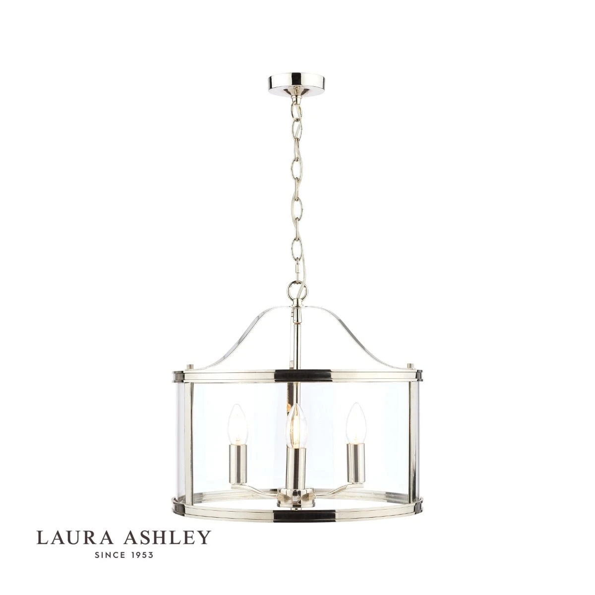 The clean-lined Laura Ashley Harrington ceiling pendant light is a graceful blend of clear glass and sleek metal. A simple, lantern-style drum-shaped case surrounds a suspended trio of lampholders, all in a vintage polished nickel finish for effortlessly elegant looks. The 3 light Harrington ceiling pendant is a subtle yet stylish piece to illuminate your favourite room and create a bright, inviting space.