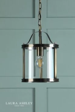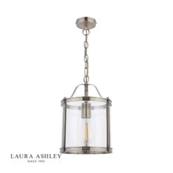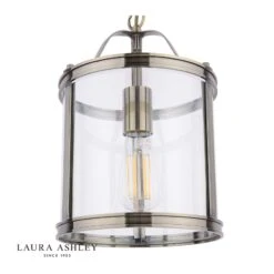 The clean-lined Laura Ashley Harrington ceiling pendant light is a graceful blend of clear glass and sleek metal. A simple, lantern-style drum-shaped case surrounds a suspended trio of lampholders, all in a vintage finish for a effortlessly elegant look. The 1 light Harrington ceiling pendant is a subtle yet stylish piece to illuminate your favourite room and create a bright, inviting space. Fitting, matching ceiling rose and hanging chain included, plus a discreet cable. Bulb not included; takes 1 x 60W max ES GLS. Height is adjustable at the point of installation (35–140cm).