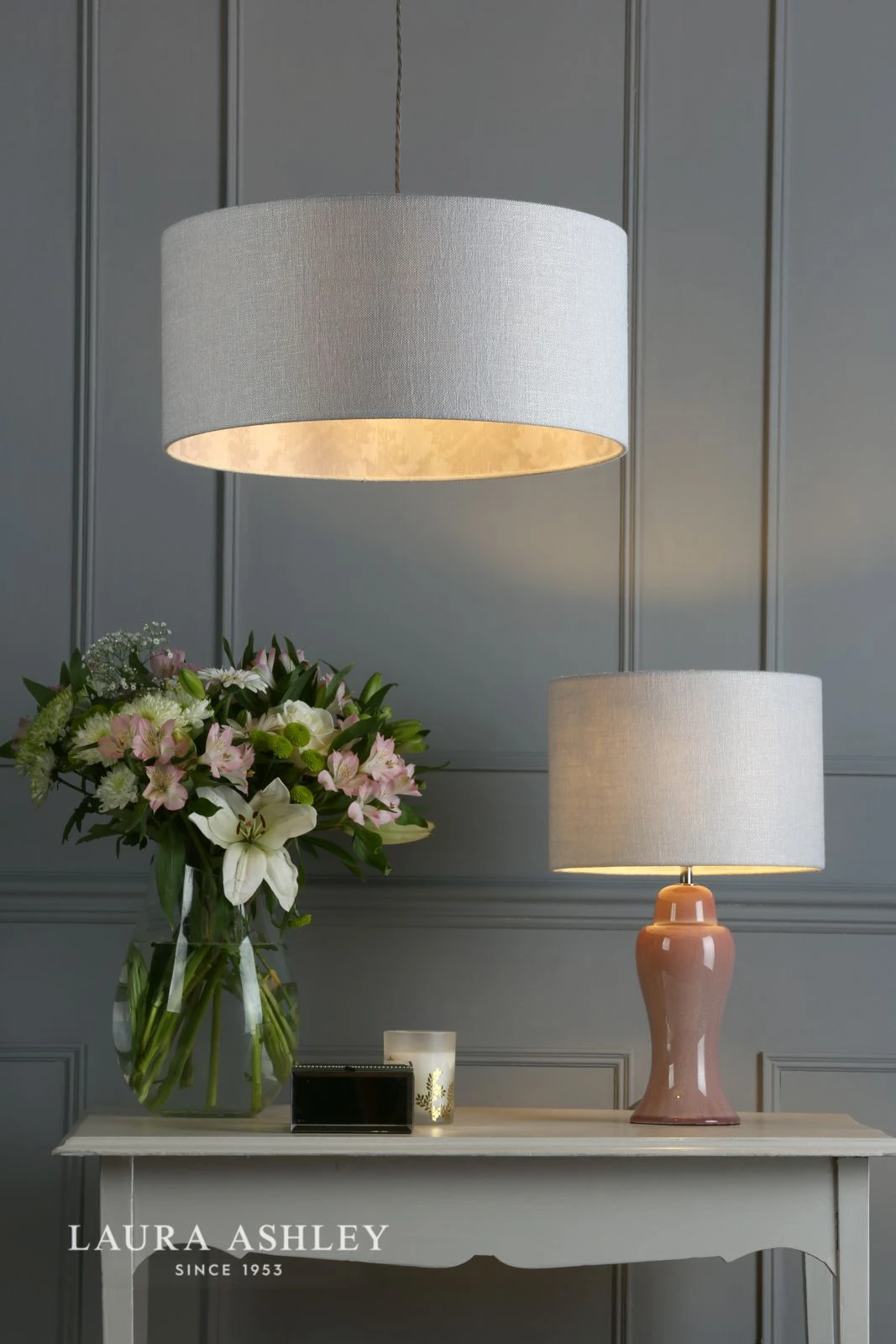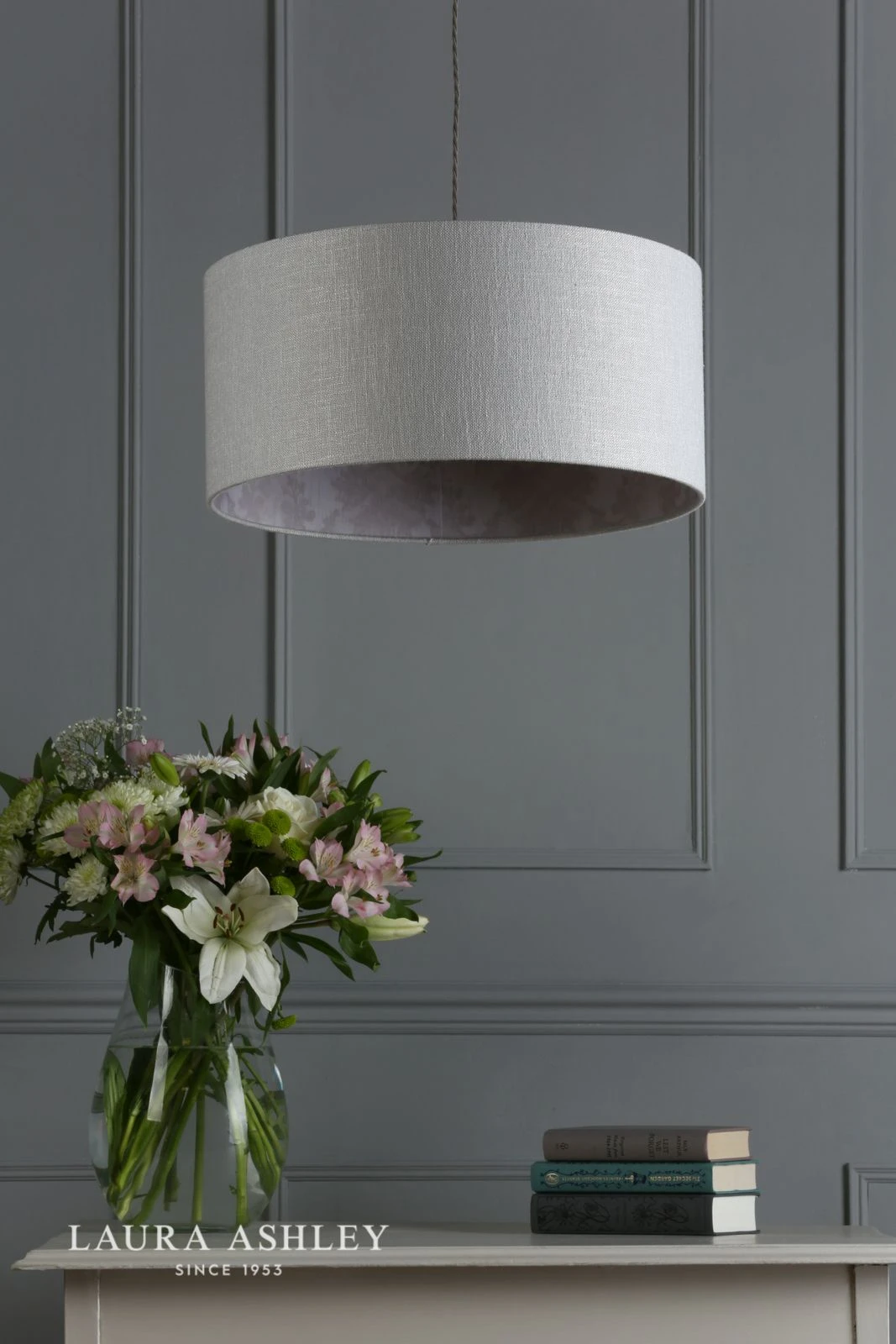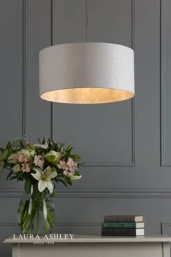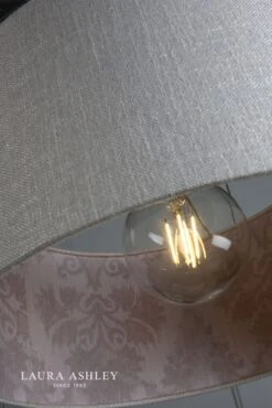 The Hazleton lamp shade from Laura Ashley has a classic, cylindrical drum shape. Covered in a quality linen in silver, it has the beautiful feature of being lined with a toning pink damask print taken from the Laura Ashley archive. Perfect for adding just a hint of pattern, which will not only complement other patterns but is also ideal to team with décor in solid colours.