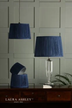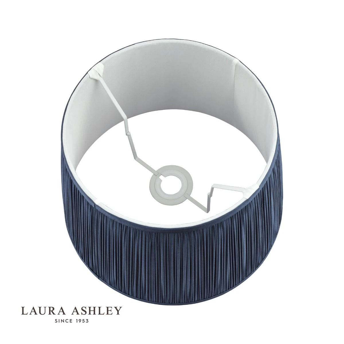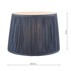 The Laura Ashley Hemsley lightshade has a classic, slightly angled, Empire drum form. The diameter of this size is 30cm. Here we finish it in an elegant, pleated smooth silk in midnight blue.