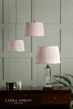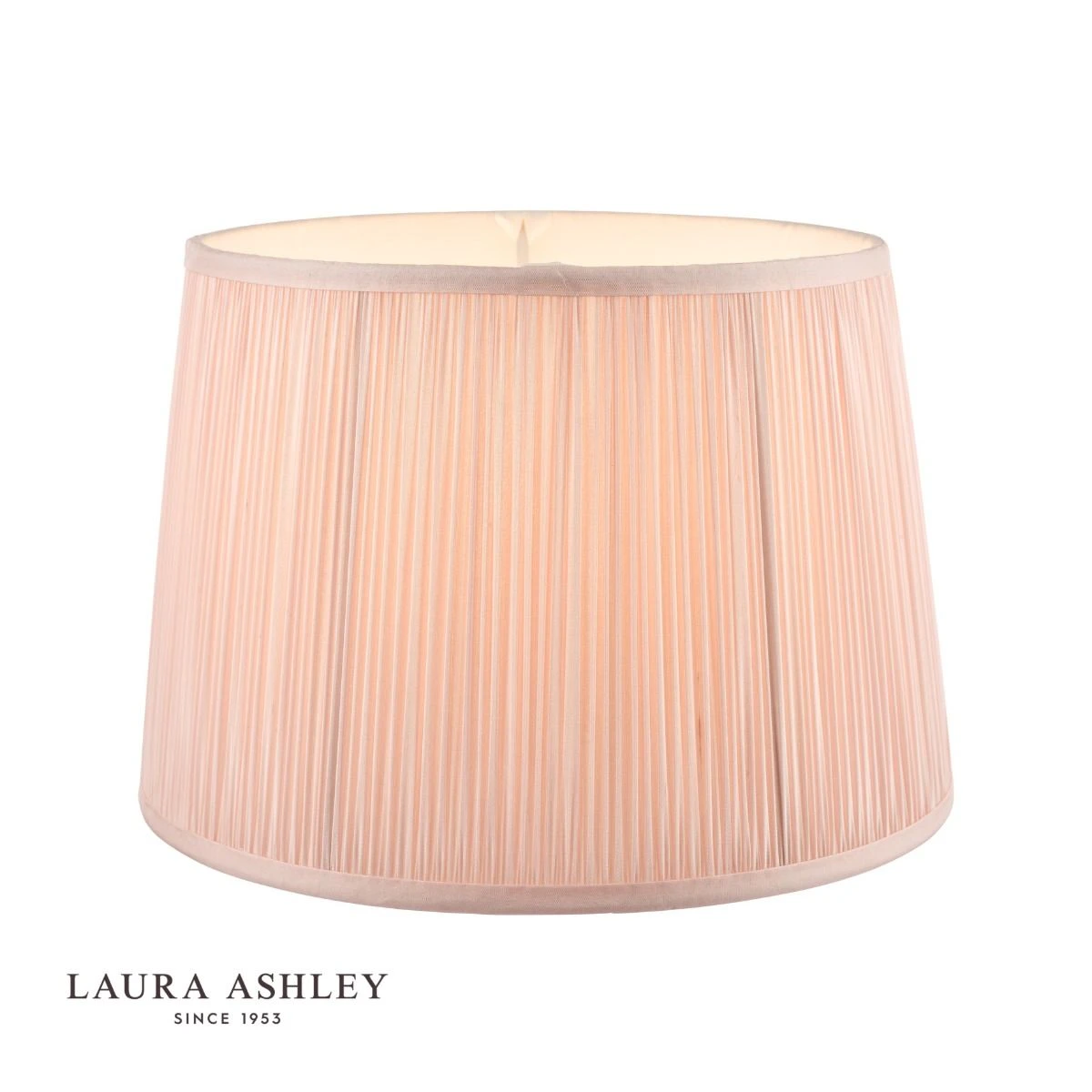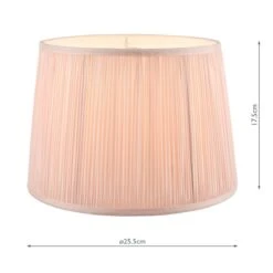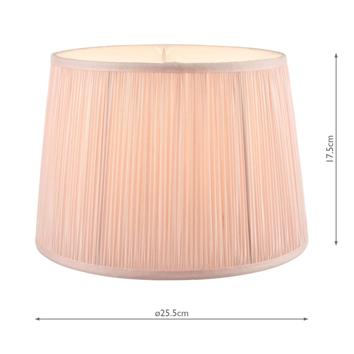 The Laura Ashley Hemsley lightshade has a classic, slightly angled, Empire drum form. The diameter of this size is 25cm. Here we finish it in an elegant, pleated smooth silk in pink.