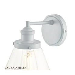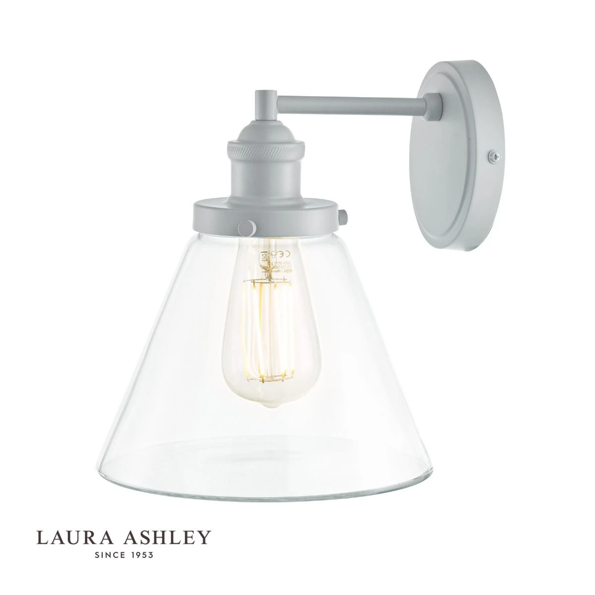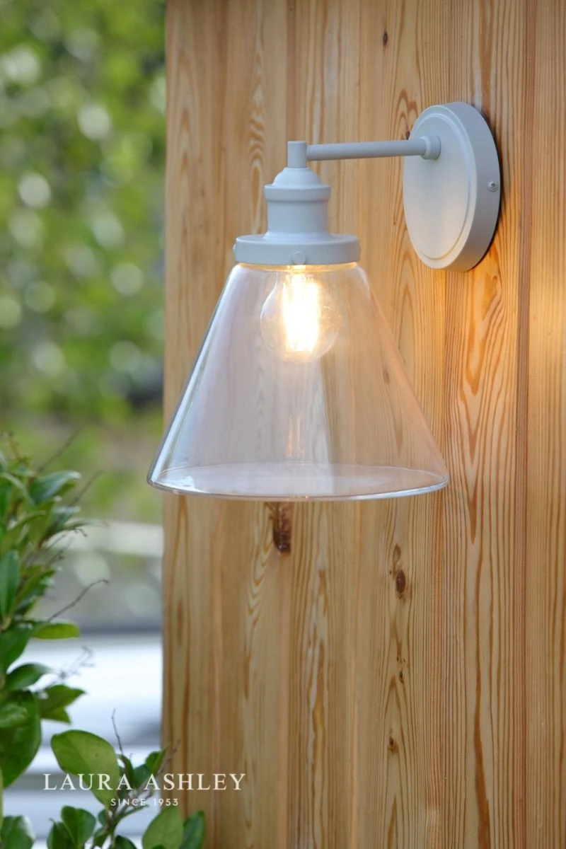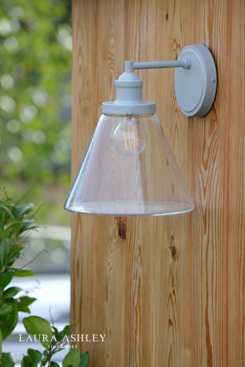 The Isaac wall light from Laura Ashley is an elegantly proportioned contemporary wall light, perfect for lighting a patio or can be placed beside a doorway. Cone-shaped clear glass lamp shade mounted on a round matt powder-coated finish wall plate.
