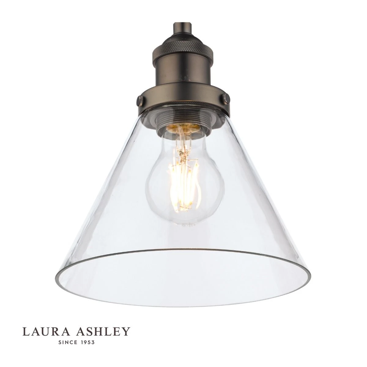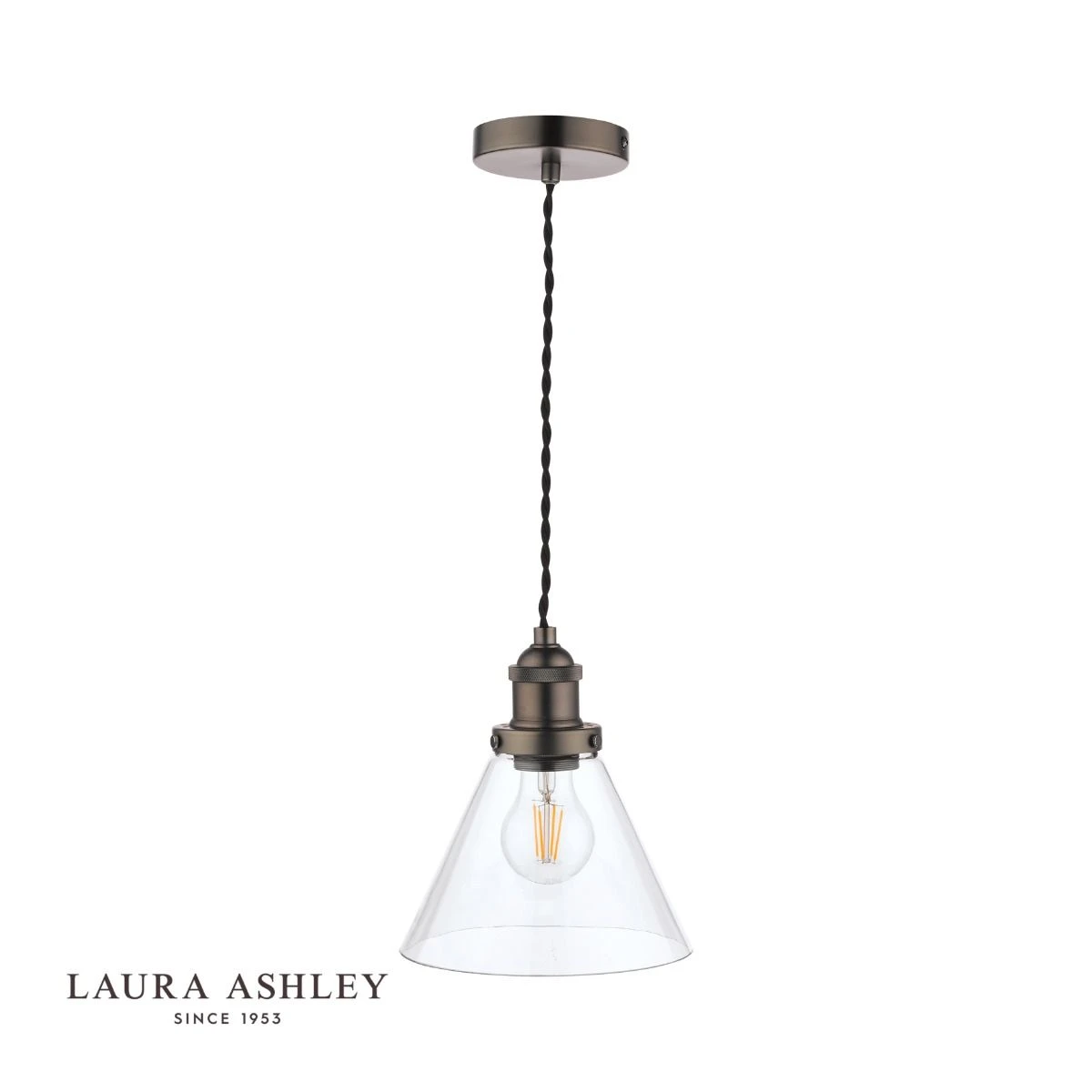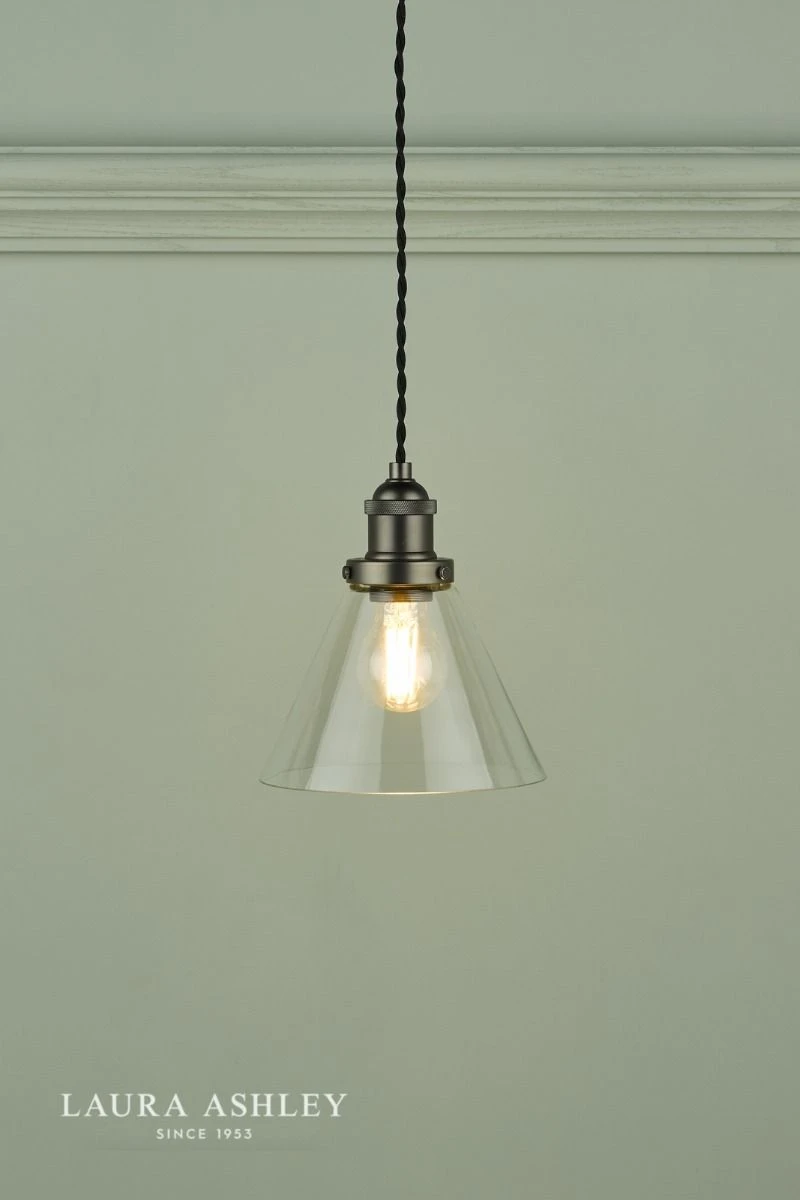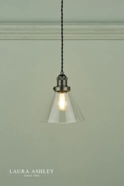 Laura Ashley’s Isaac single light pendant fits effortlessly into kitchens and dens. Bold lines and angular shapes lend a sophisticated, contemporary touch that looks fantastic against bare brickwork. This contemporary hanging ceiling light boasts industrial appeal with an industrial nickel finish and cone-shaped clear glass shade.