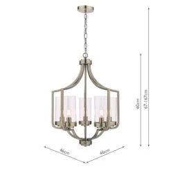 The Joseph chandelier from Laura Ashley was inspired by the draped form of a Moroccan tent. This out of the ordinary chandelier has five individual lampholders, each supporting a clear glass cylinder shade, held on arms that continue upwards to form an open lantern-style framework. It is finished in warm antique brass.