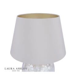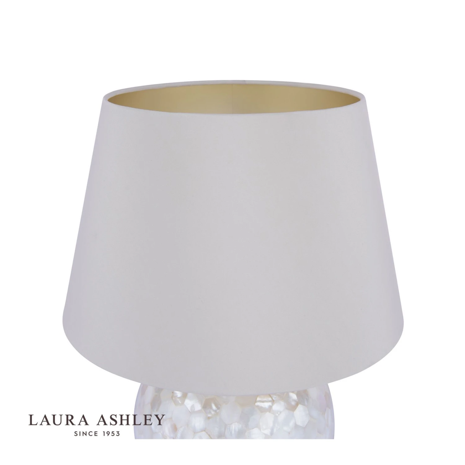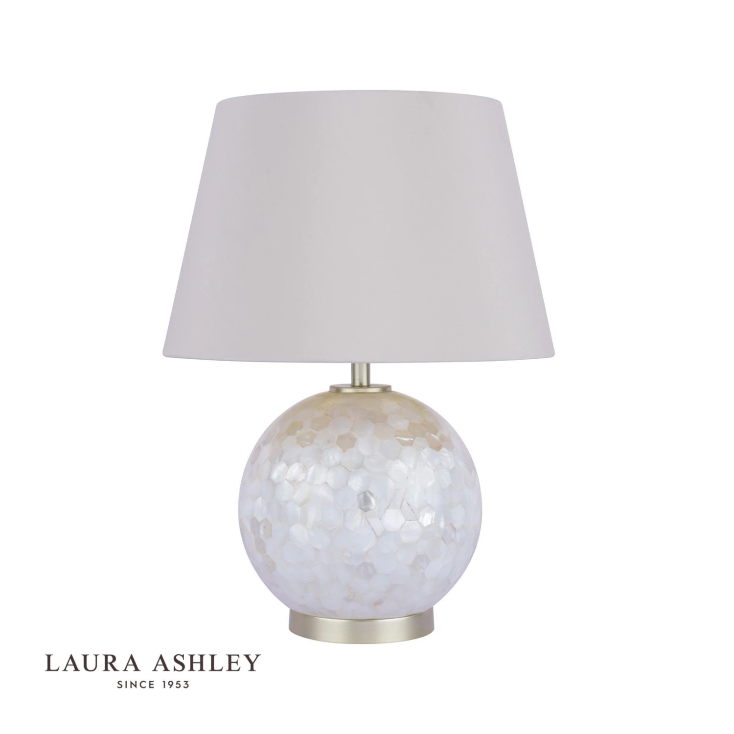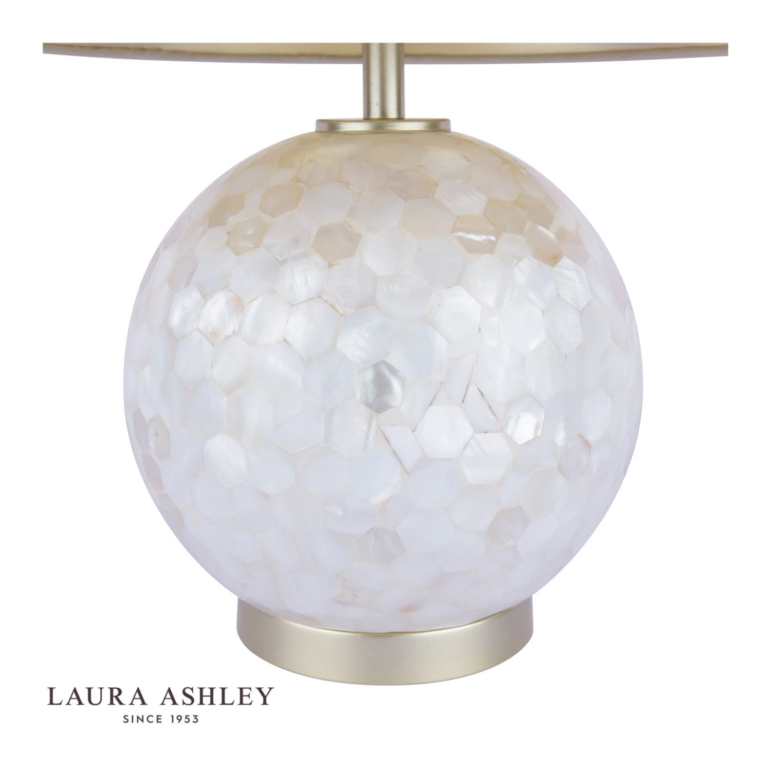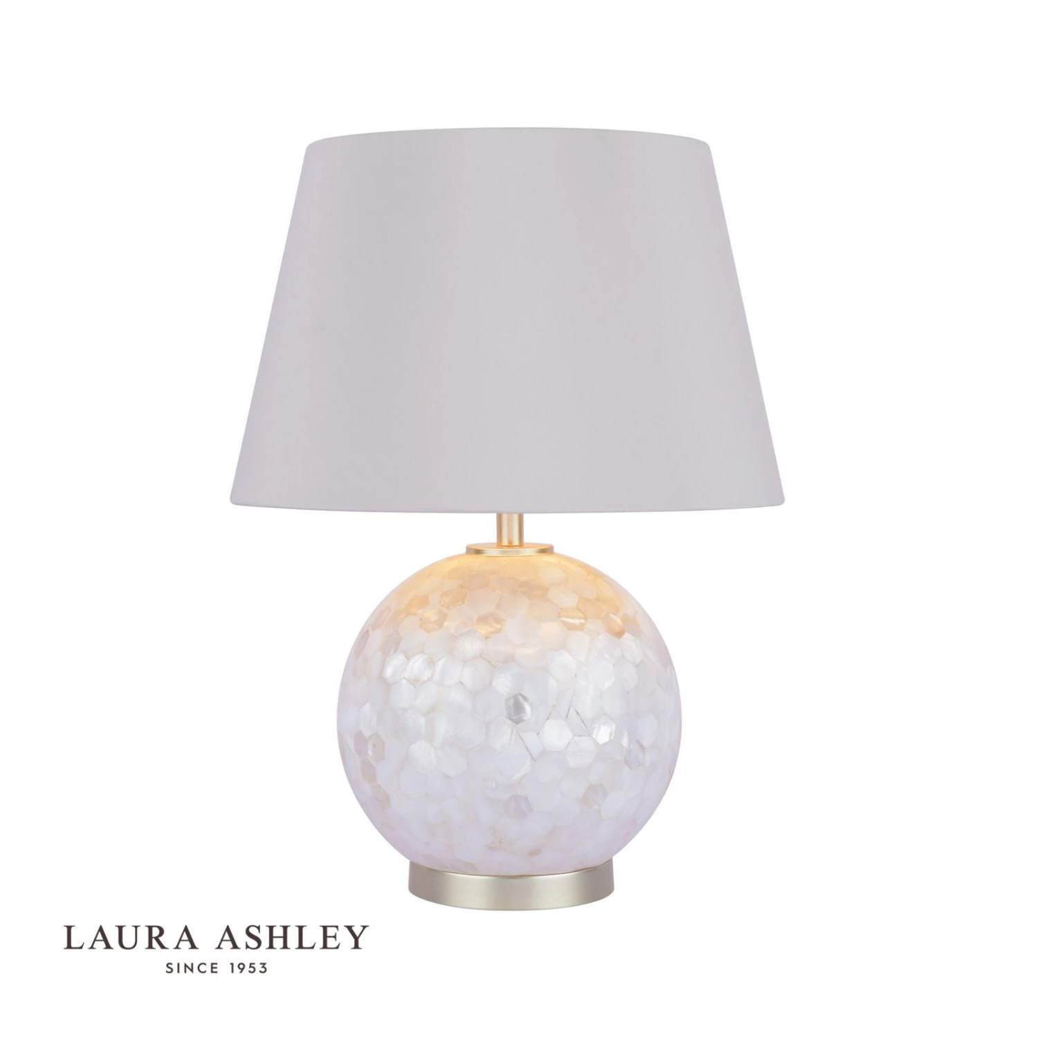 The Mathern Table Lamp by Laura Ashley is hand made with mother of pearl expertly cut into hexagonal shapes to create a unique piece. The champagne gold finished metal complements the natural tones on the mother of pearl perfectly. Paired with an Ivory faux silk tapered drum lamp shade with a soft gold lining. Colour and pattern variations are to be expected, so each lamp in your home will be unique. This product has a clear cable with an inline switch. Bulb not included; takes 1 x 40W max SES GLS.