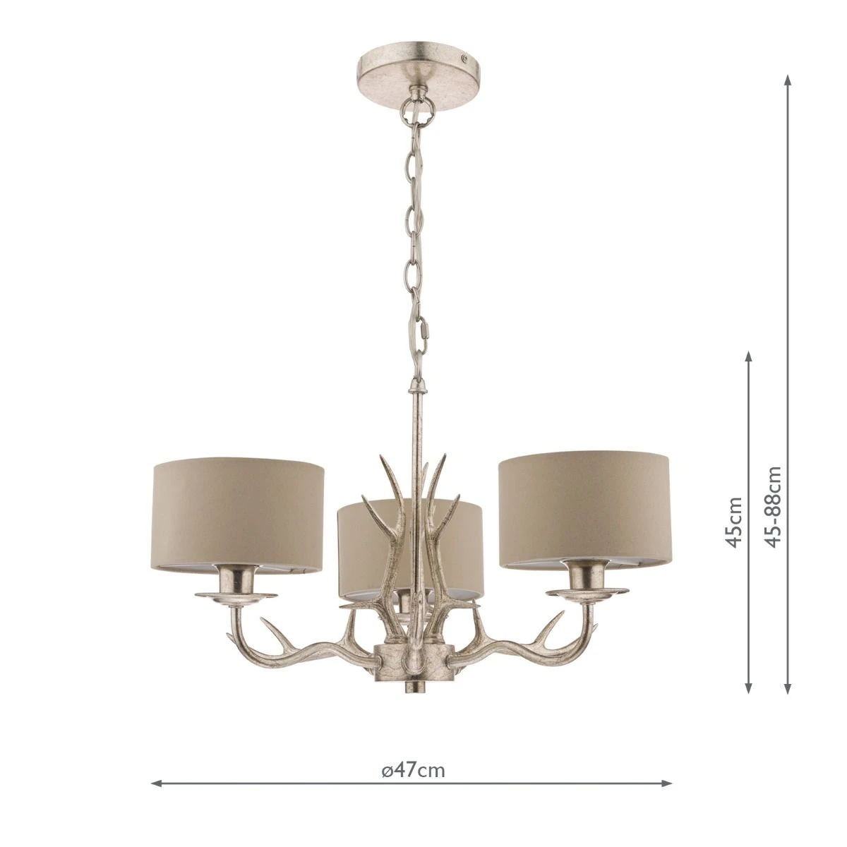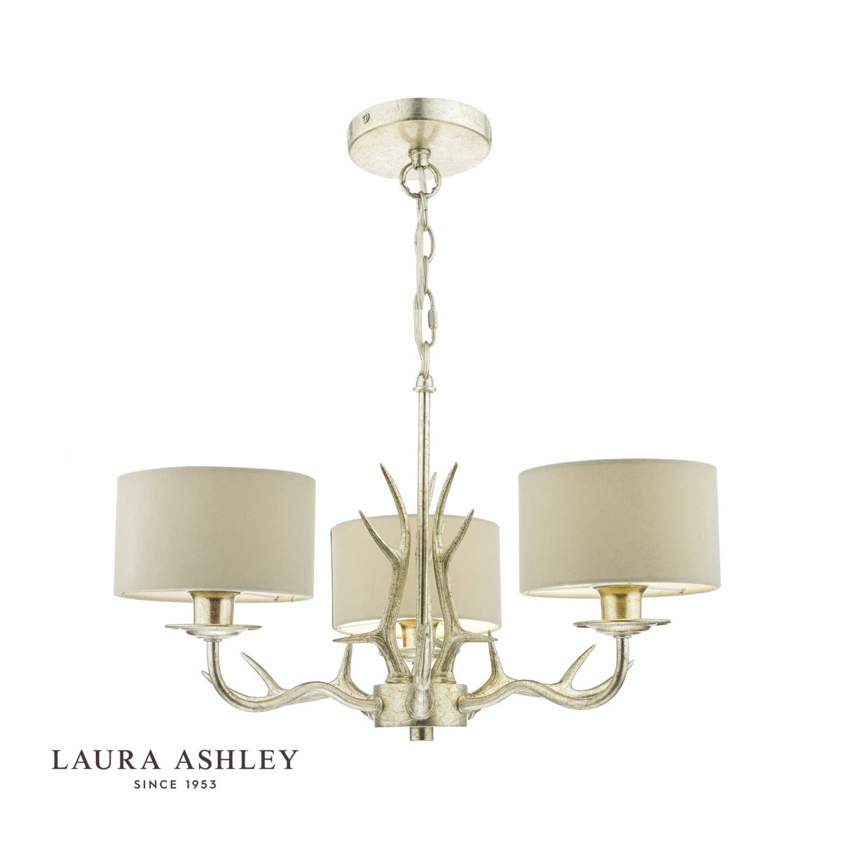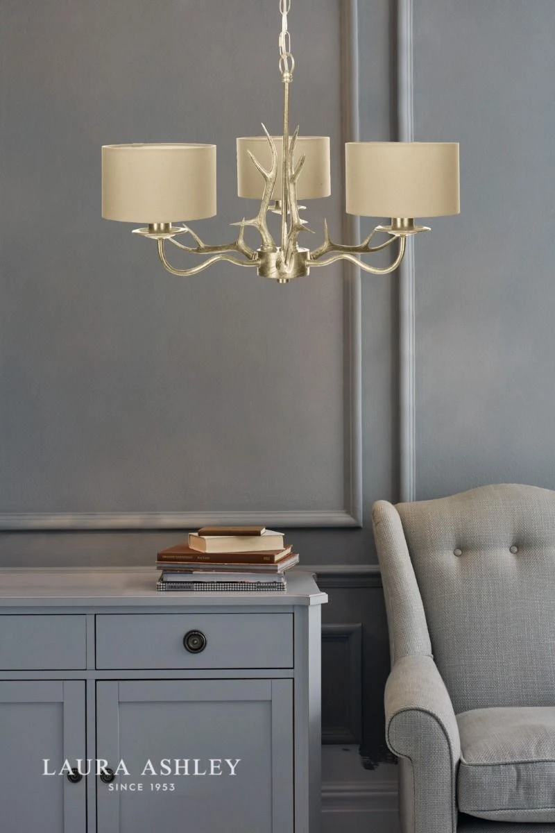 Make a statement with the Laura Ashley Mulroy 3-armed ceiling fitting, a beautifully crafted, candelabra style chandelier that makes a rather grand, country house statement. Featuring a resin antler design, this contemporary interpretation of a nostalgic style boasts a hand-finished shimmering antique champagne look for a touch of luxury. Shades in a sheened, natural colour fabric are included.