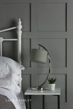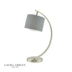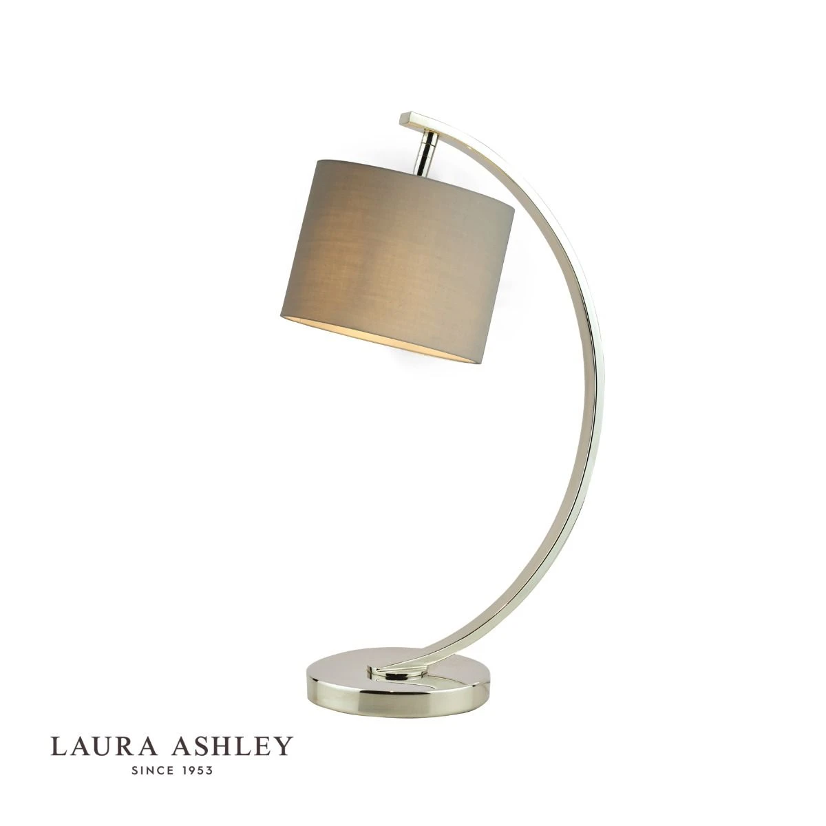 A thoroughly modern small table lamp, the Noah from Laura Ashley comprises a charcoal slubbed linen drum shade held aloft by a curved ribbon stem, itself poised on a round base, all finished in bright polished nickel.