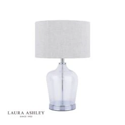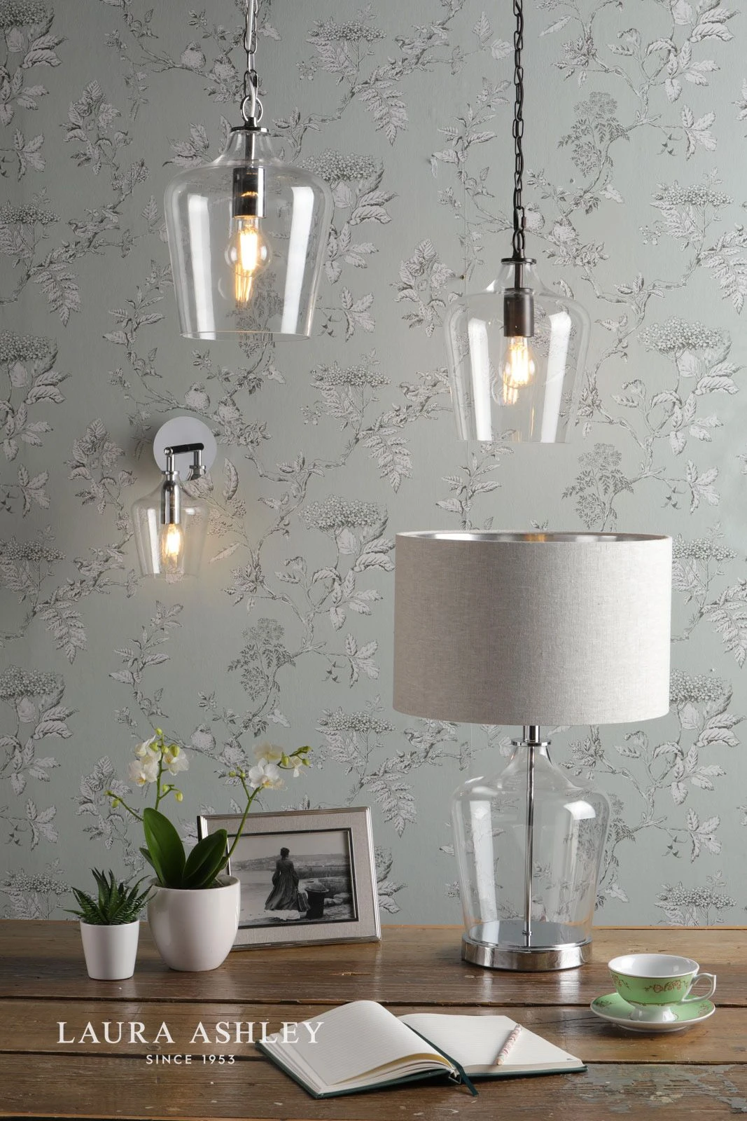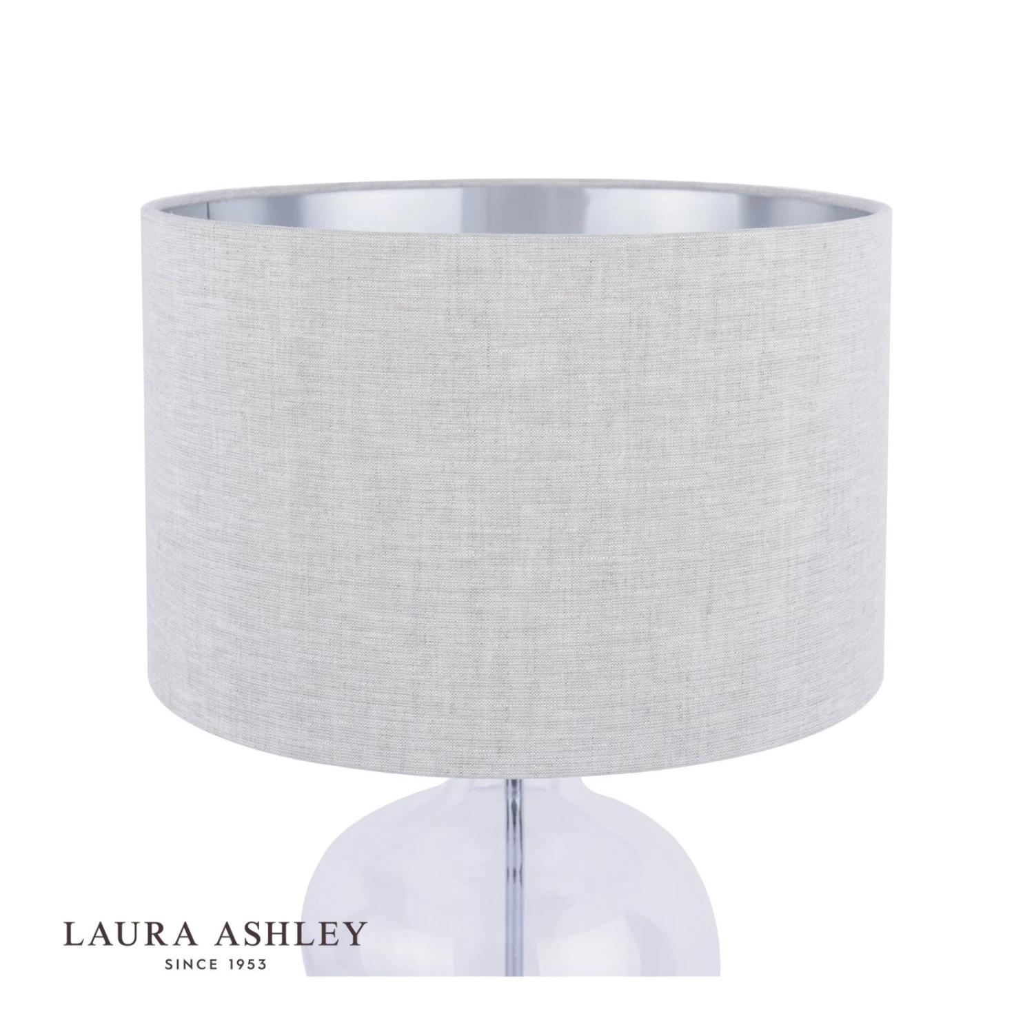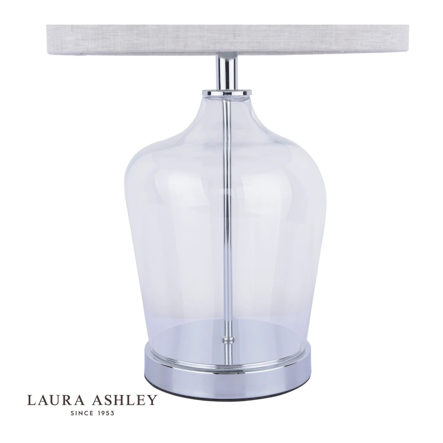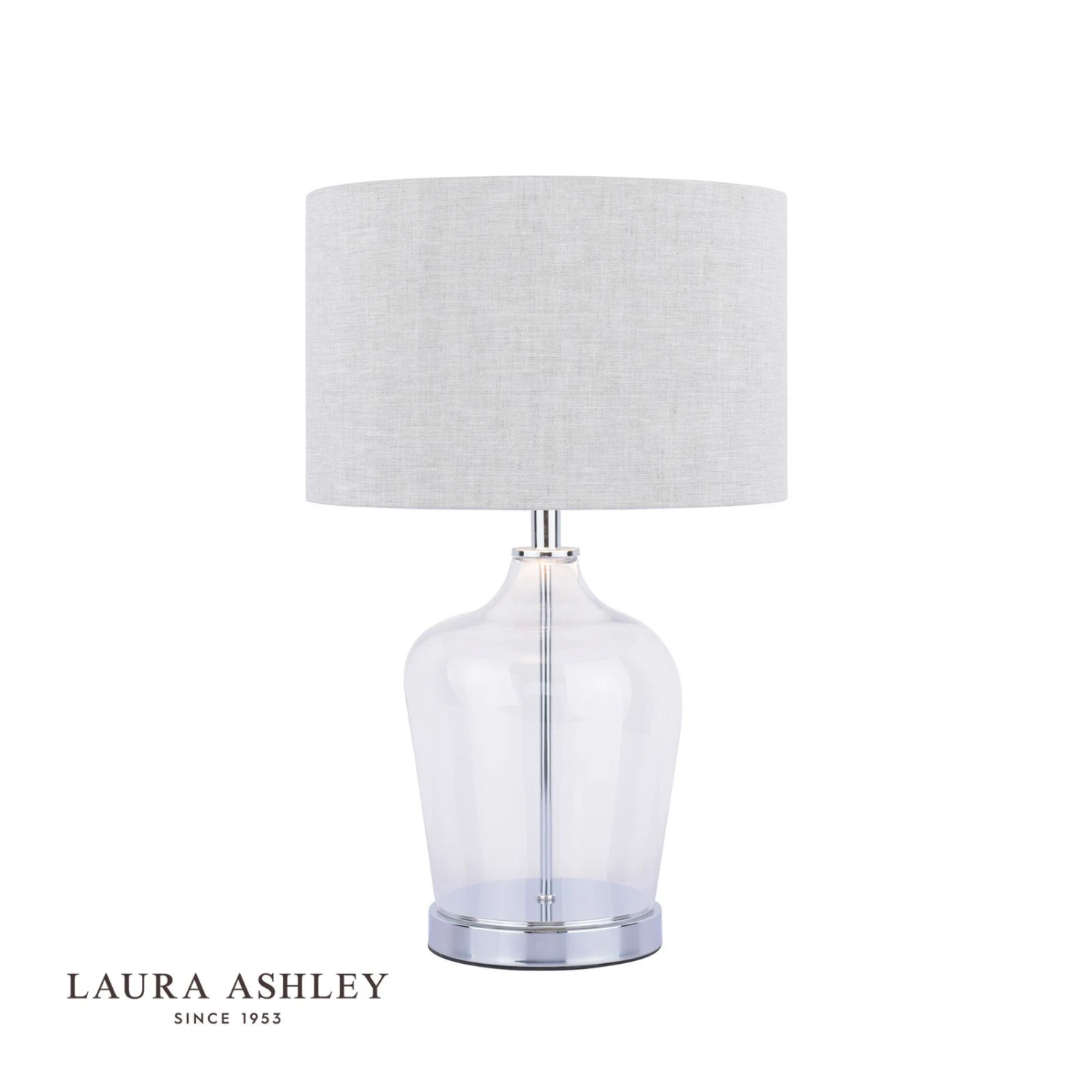 The Ockley Table Lamp by Laura Ashley features a touch on/off polished chrome plinth beneath a clear glass vase. With a 3 stage touch switch function, simply touch once to turn on and again to dim and then to turn of. Paired with a grey shade with a metallic inner. A perfect table lamp for any room. This product has an grey fabric cable. Bulbs not included; takes 1 x 60W Max ES.