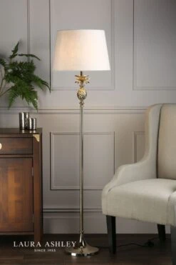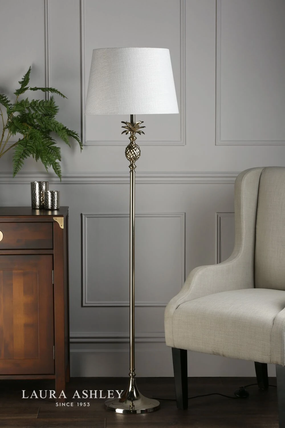 With a slender form and a luxurious polished champagne finish, the elegant Penelope floor lamp epitomises the style of iconic brand Laura Ashley. It will be a stylishly exotic introduction to your living space. The smooth stem has turned details and is adorned with a leafy pineapple, depicted in great detail, with the fruit itself in a realistic matt finish. The petite metal pineapple itself looks like a carved sculpture. Base only; a Ø 40cm (16”) empire shade is recommended (illustrated shade not included).
