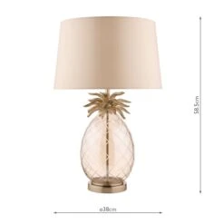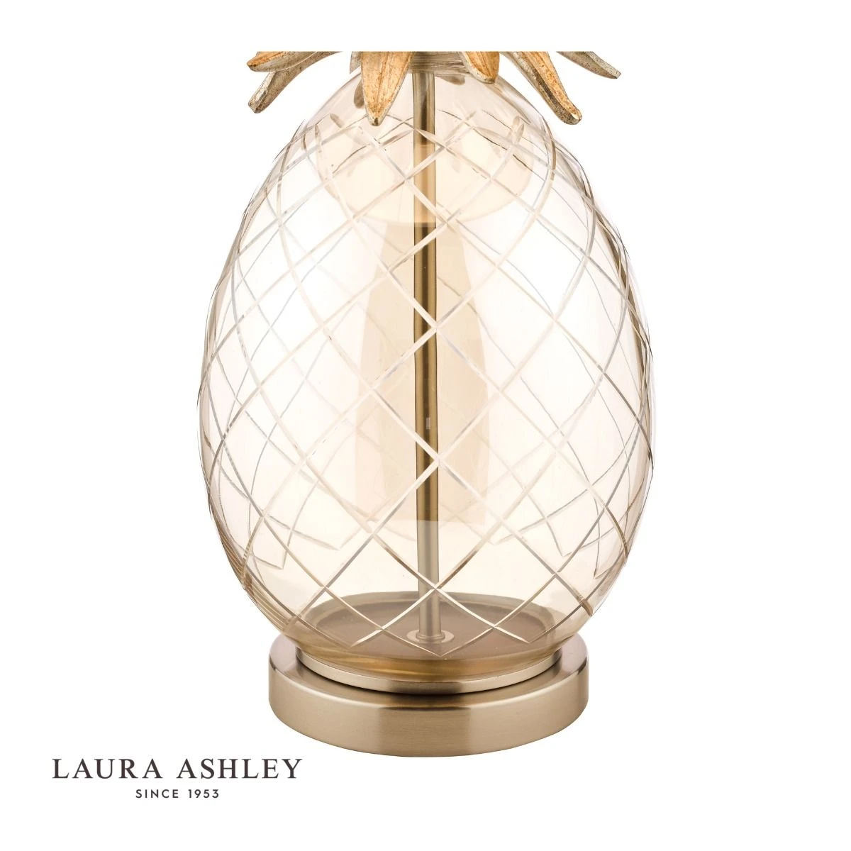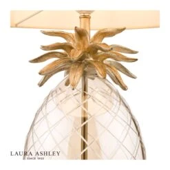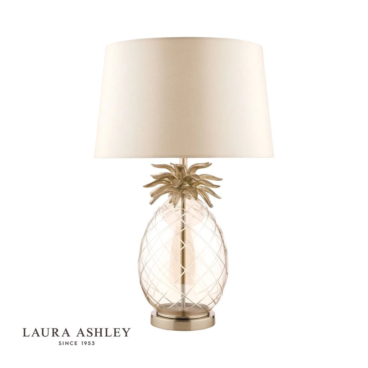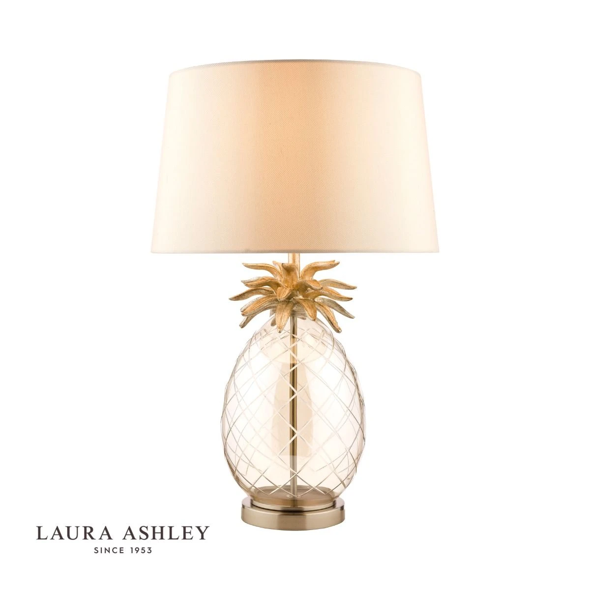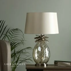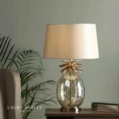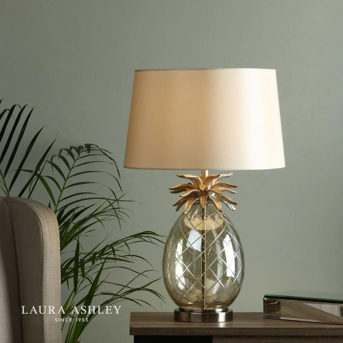 Feeling fruity? Create quirky home style with the small Laura Ashley Pineapple table lamp, and give your room some real character. The base is a pineapple shape, formed from champagne tinted, hand cut glass, and it is topped with resin pineapple leaves and tailed with a flat ring, both painted by hand in champagne gold. Paired with a glamorous taupe faux silk tapered drum shade, this fresh new take on home lighting is a contemporary focal point that will take your living room from dull to delectable.
