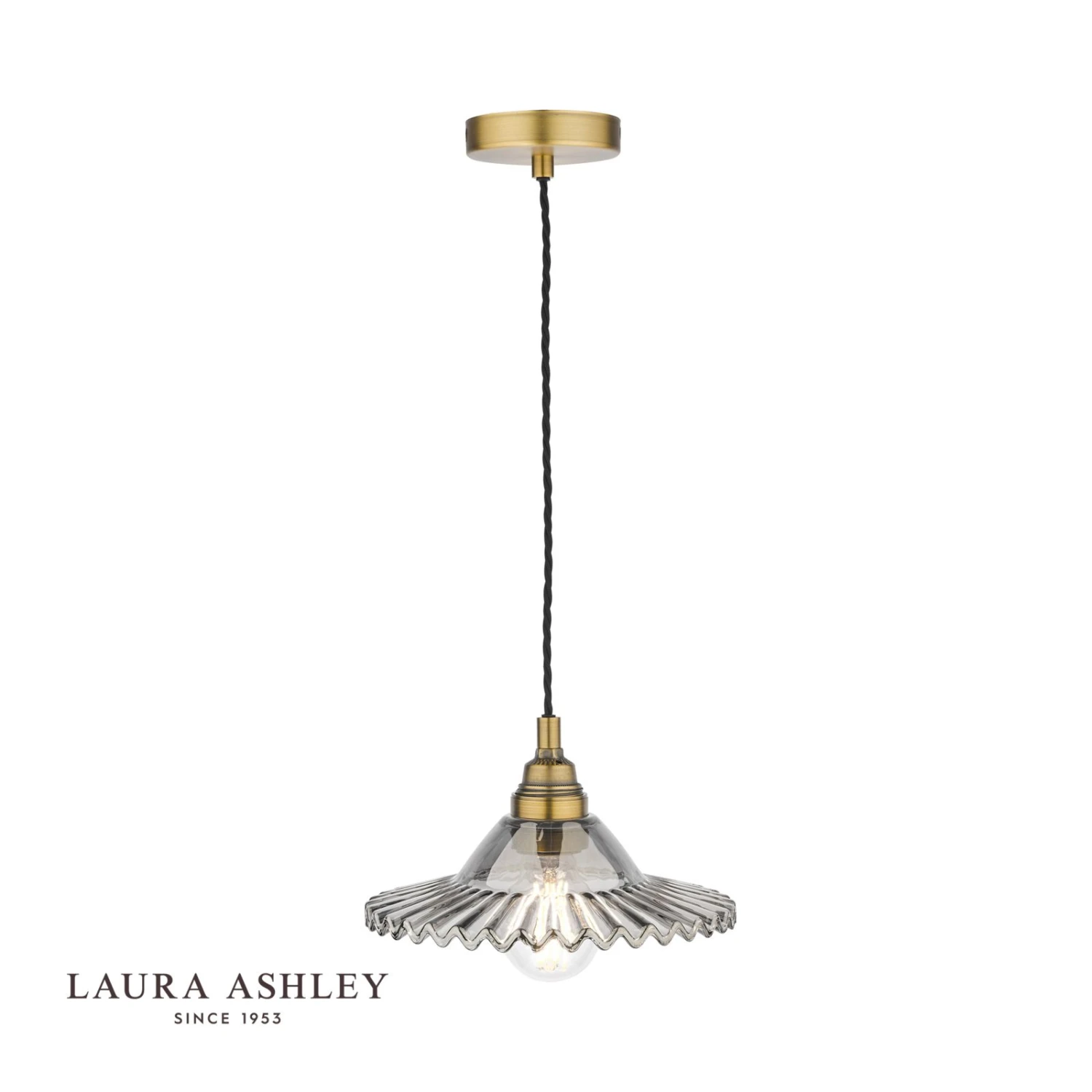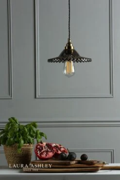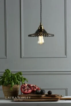 Think vintage farmhouse meets urban kitchen! With pretty frilled edges like a ballerina’s tulle skirt, the petite Pippa pendant ceiling light from Laura Ashley is a delight. Also reminiscent of the undulations on a clam shell or pie crust, the Pippa is in smoked glass and is teamed with fittings in aged brass and a matching flat round ceiling rose. This charming pendant shade will suit a smaller room; place strategically over a task area, or you could arrange several in a row or staggered cluster over a kitchen island. Upon fitting, you can adjust the length of the twisted black braided-fabric feature flex to alter the height to suit your space (14. 5–115cm); it is suitable for lower ceilings and smaller rooms.