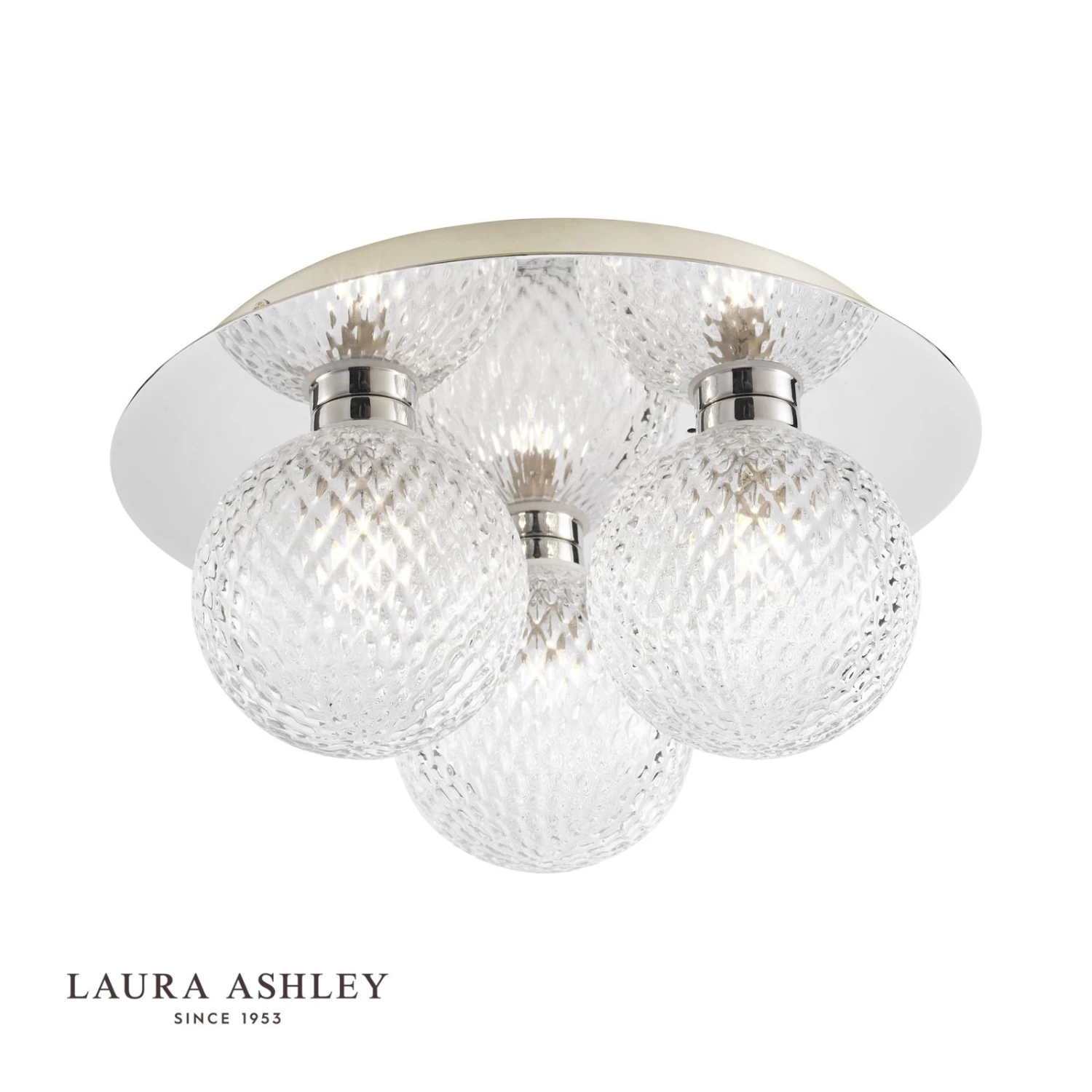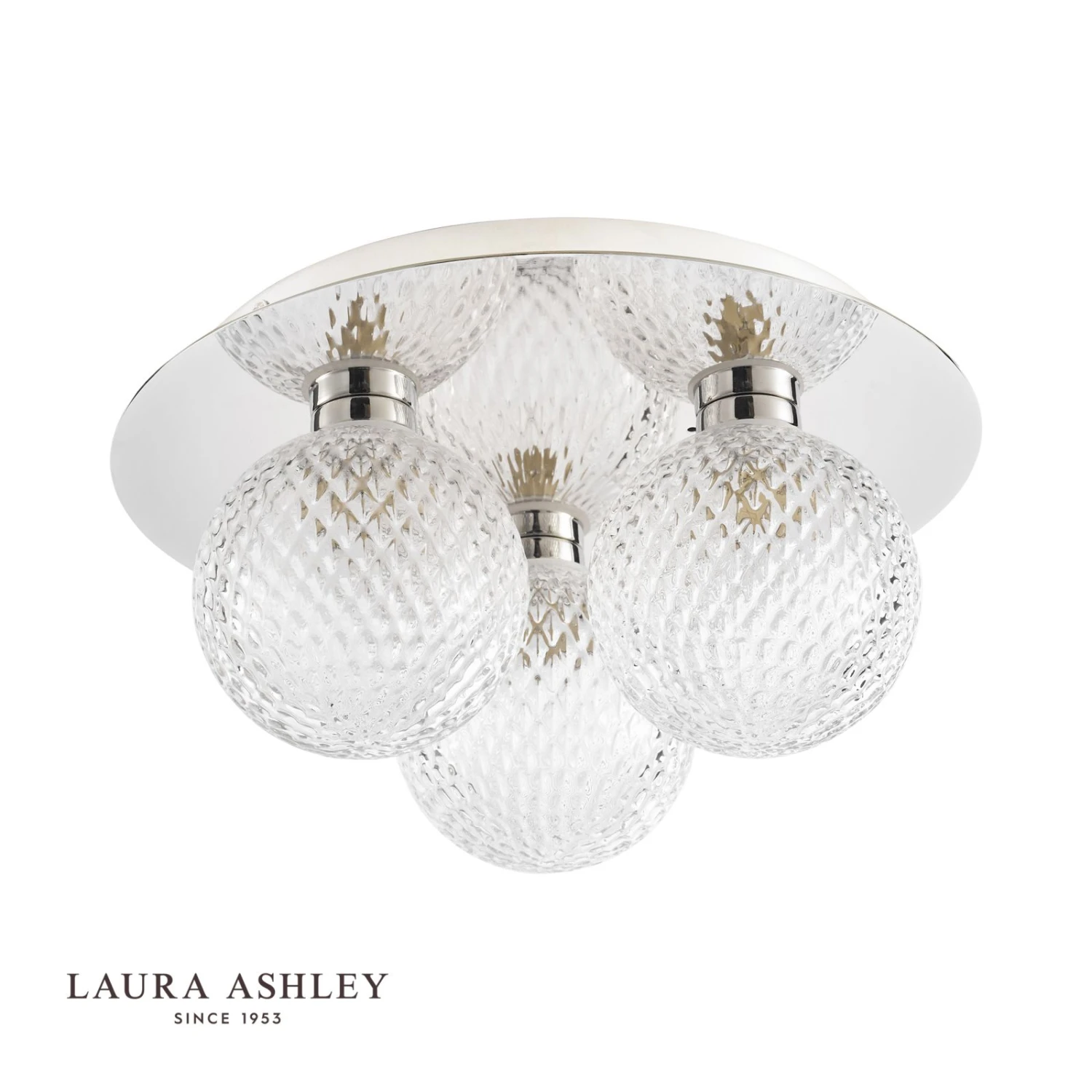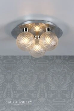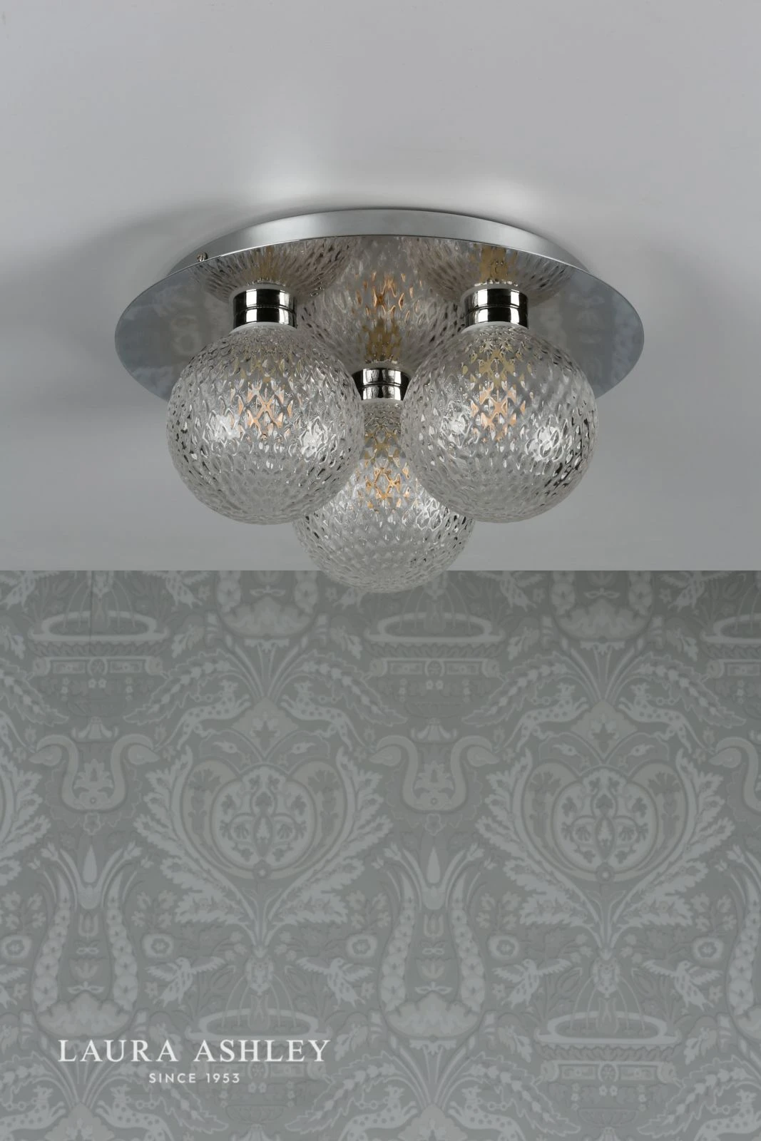 Specifically designed for the bathroom, the elegant Prague range from Laura Ashley is decorative as well as functional. With clear textured glass, the globe shades partially conceal the light bulbs and cast a sparkly light. The full flush ceiling light has a luxurious contemporary look and features large flat disc ceiling plate, which conceals the cables. It is suitable for lower ceilings.