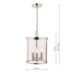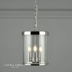The Laura Ashley Selbourne ceiling pendant is an innovative melding of old and new styling. A simple lantern style glazed cylinder contains an apparently floating clustered trio of lampholders, all in a vintage polished nickel finish.