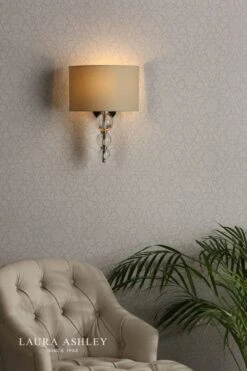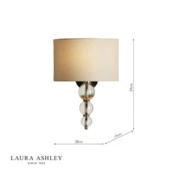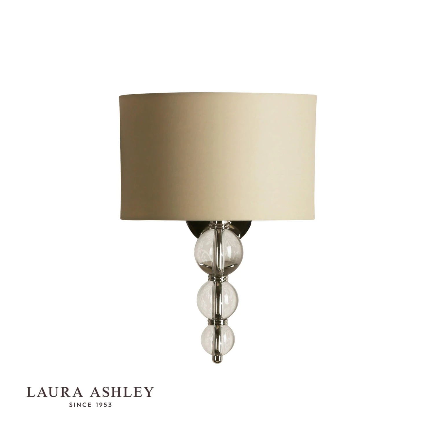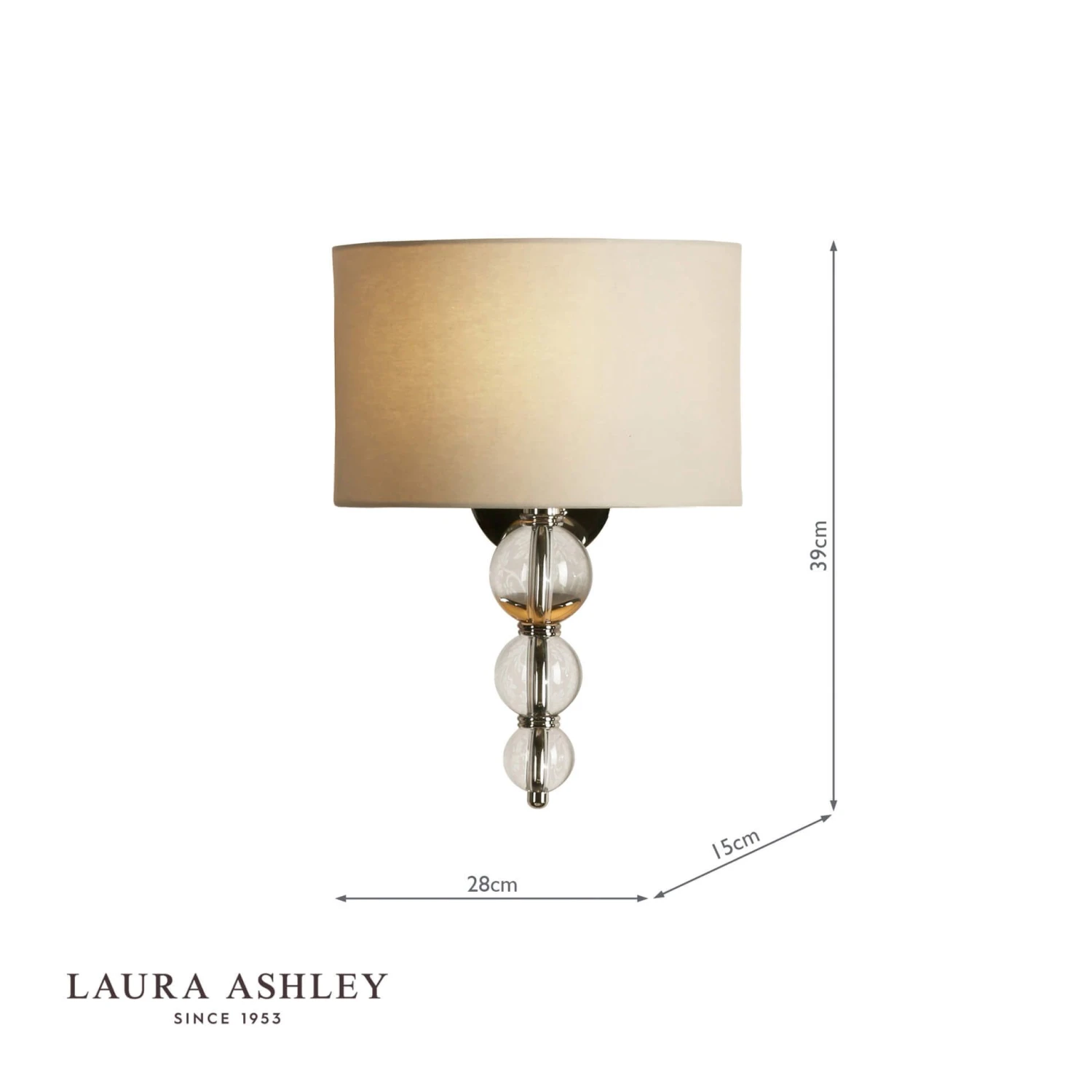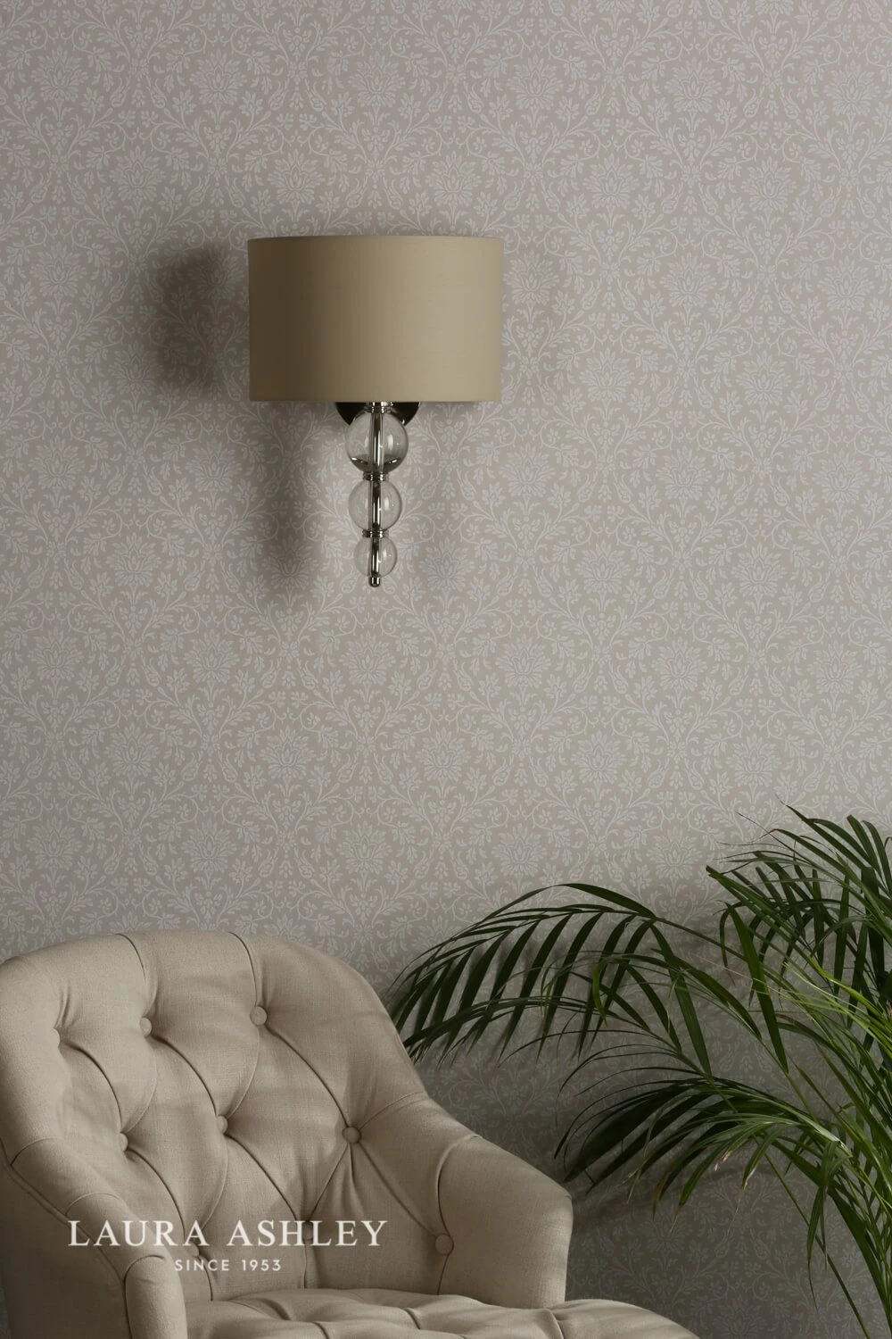 The Laura Ashley Selby wall light has an elegant spindle form threaded in tapering size with pretty faceted balls of clear glass. With a beautiful, polished nickel finish, the Selby wall light fitting will enhance any interior, whether traditional or contemporary in style. Comes complete with a shade in a sophisticated pale oyster gold linen-effect cotton. Takes 1 x 40W max SES small Edison screw cap candle shape light bulb (not included).