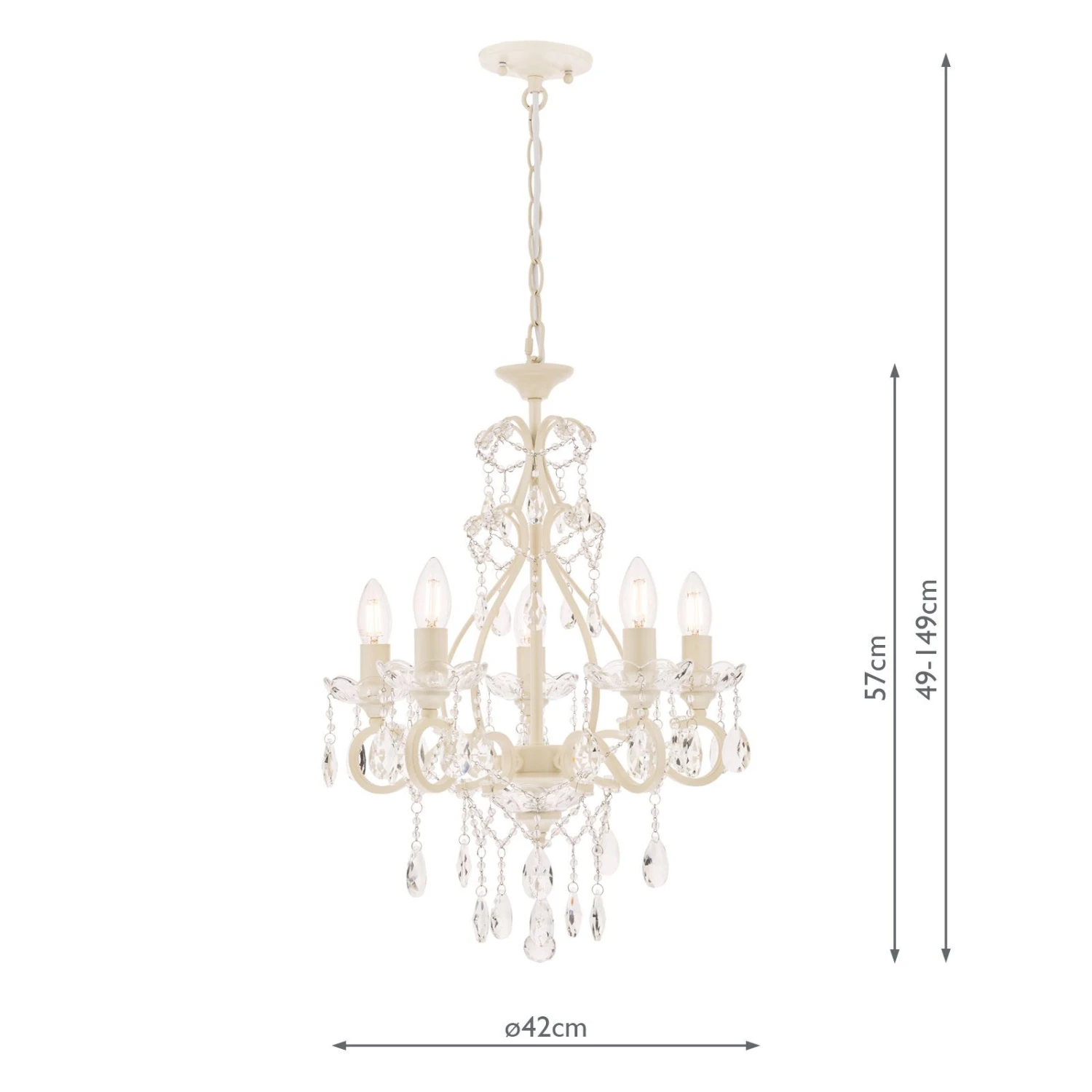 This ceiling pendant fitting has a matching finish ceiling rose and hanging chain plus a white cable. Shades not needed. Height is adjustable at the point of installation (49–149cm).