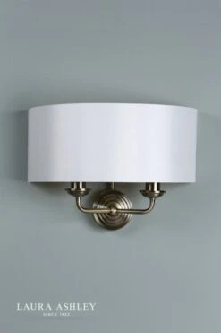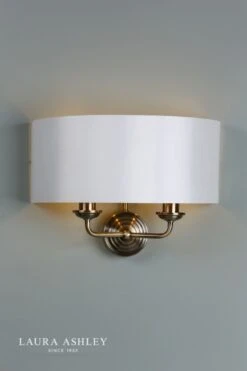 Subtle and sophisticated, the Sorrento double wall light from Laura Ashley boasts two lights on arms, both encased in a single contemporary demi-drum shade in sleek ivory silk-effect fabric with a pearlised inner. This 2 light wall fitting has a round, Art Deco style, stepped wall plate, and comes in a traditional warm antique brass finish, adding grown-up atmosphere to your dining or living area.