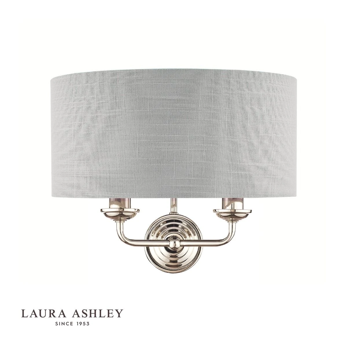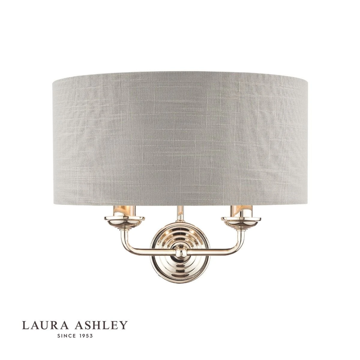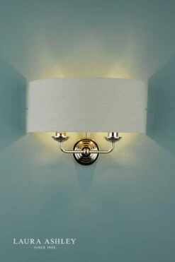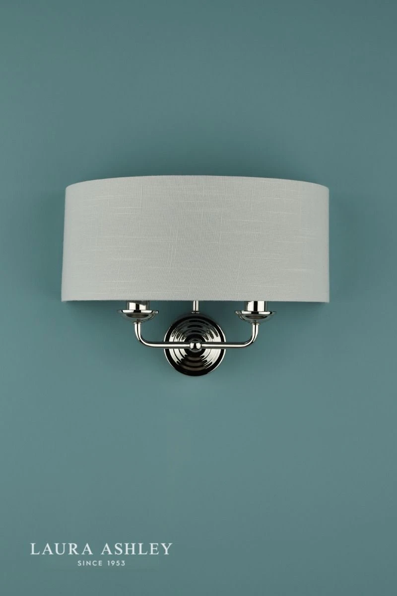 Cool and smart, the Sorrento double wall light from Laura Ashley boasts two lights on arms, both encased in a single contemporary demi-drum shade in silver slubbed linen with a metallic silver inner. This 2 light wall fitting has a round, Art Deco style, stepped wall plate, and comes in a velvety brushed chrome finish, adding grown-up atmosphere to your dining or living area.