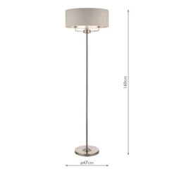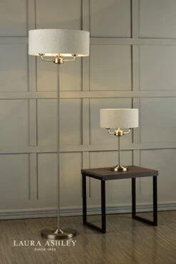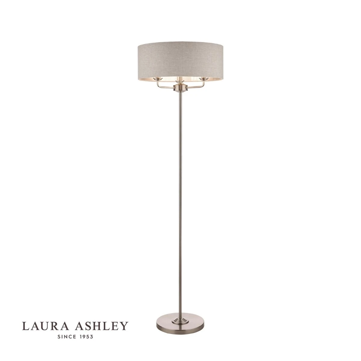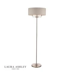 Chic and on-trend, the attractive Sorrento floor light from Laura Ashley boasts three lights on arms, all encased in a single contemporary drum shade in natural slubbed linen with a metallic silver inner. A straight stem rises up from a round, flat base with stepped, Art Deco style, detail. This triple light floor lamp comes in a velvety Satin Nickel finish, adding grown-up atmosphere to your dining or living area.