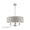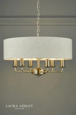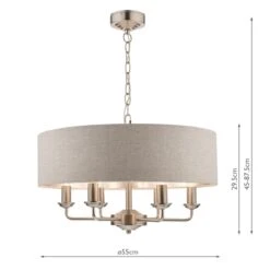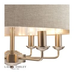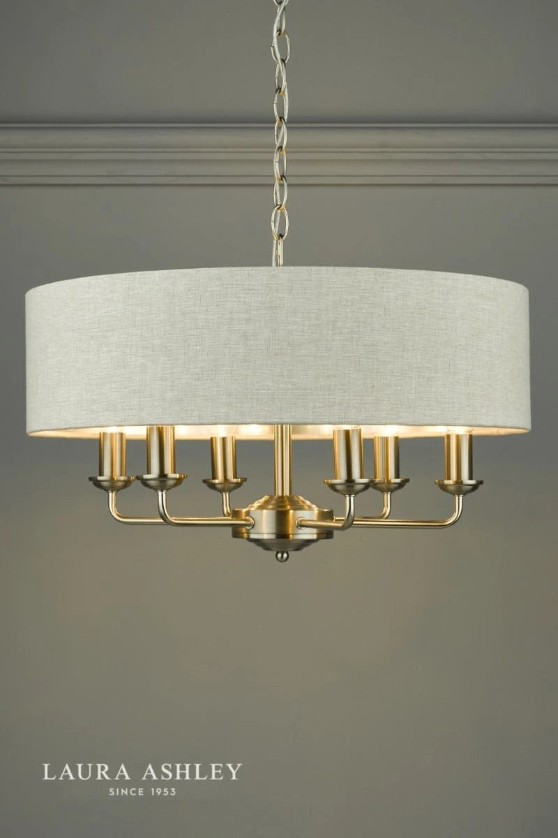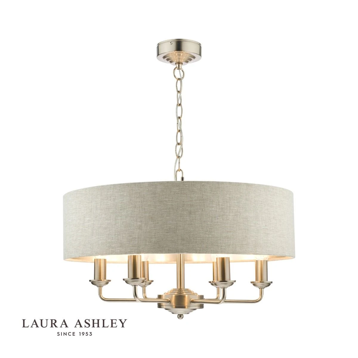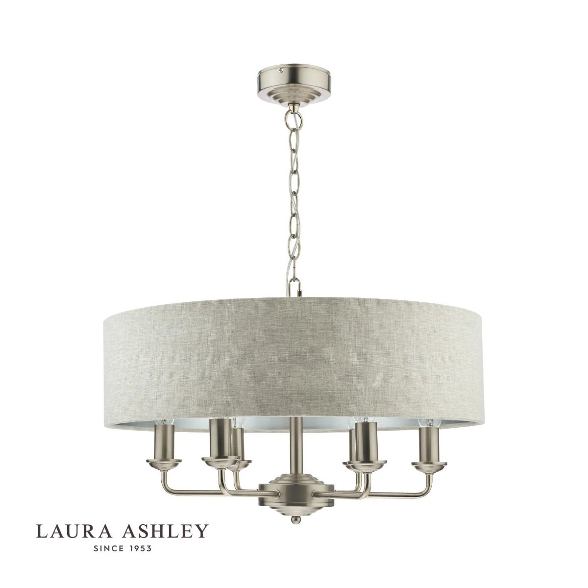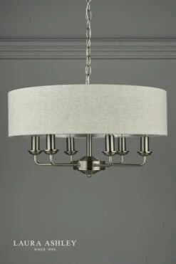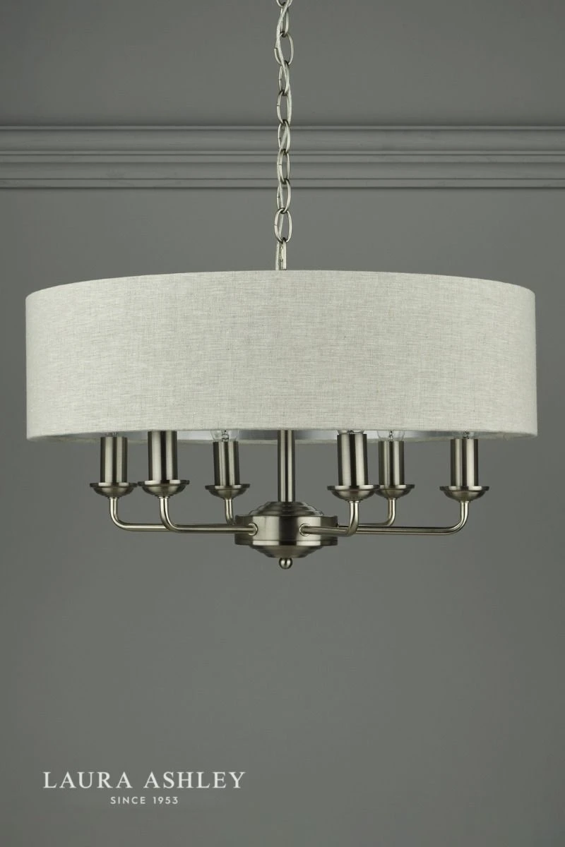 Chic and on-trend, the attractive large Sorrento ceiling light from Laura Ashley boasts six lights on arms, all encased in a single contemporary drum shade in natural slubbed linen with a metallic silver inner. A hanging chain falls from a round, Art Deco style, stepped ceiling rose. This 6 light pendant ceiling fitting comes in a velvety satin nickel, adding grown-up atmosphere to your dining or living area.