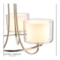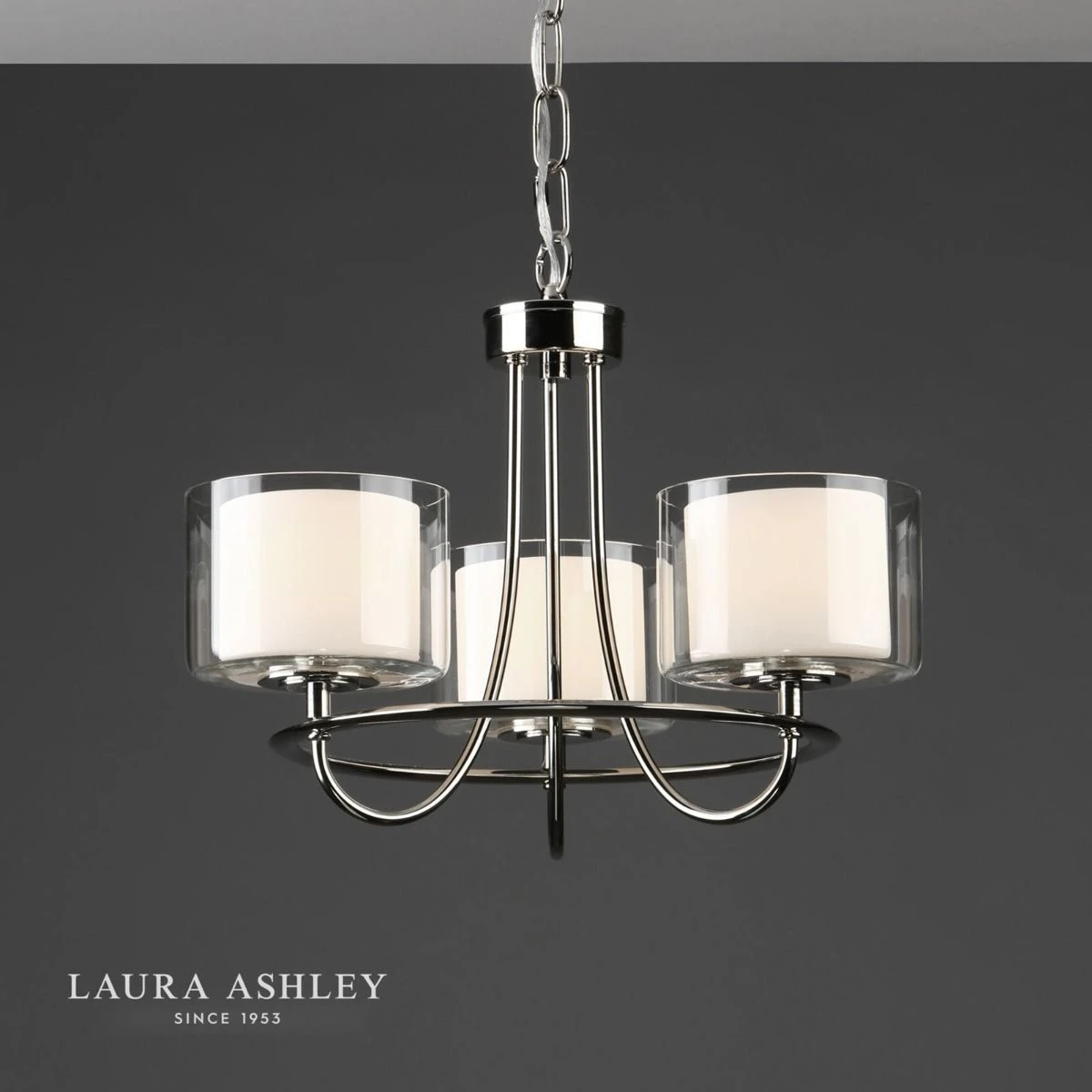 Featuring three, double-layer glass shades – clear with matt opal white inners – designed to diffuse light, and bright and beautiful polished nickel framework, the sophisticated Laura Ashley Southwell chandelier is an elegant armed pendant light that will never fail to impress. This quality 3 light ceiling fitting is designed to help you create an inviting atmosphere that you will love to unwind in as well as entertain.