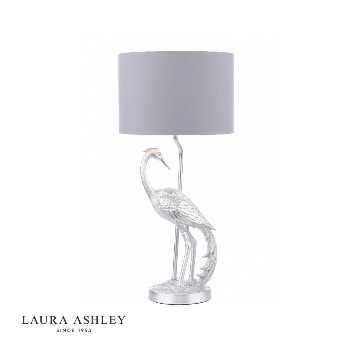 The Tregaron Table Lamp by Laura Ashley will make a quirky, yet stylish statement in your home. This striking table lamp features a Heron bird base which has been decorated by with real silver leaf. The lampshade is made in a grey cotton fabric in a drum shape with matt silver liner and a braided grey cable and an inline switch. Bulb not included; takes 1 x 40W max SES CNDL.