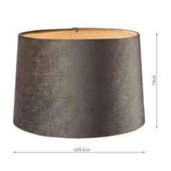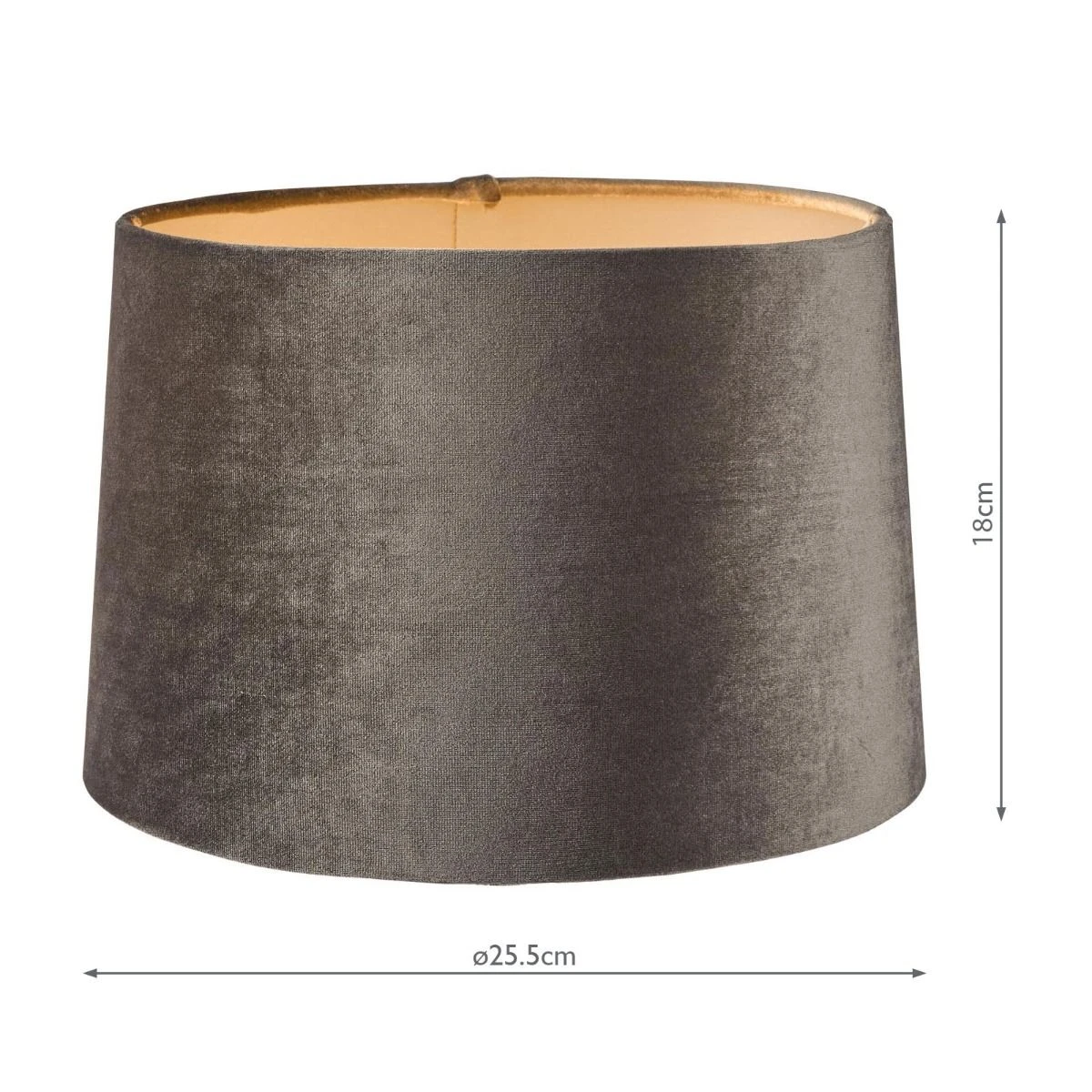 The Laura Ashley lightshade has a classic, slightly angled, Empire drum form. The diameter of this size is 25cm. Here we finish it in a sophisticated smooth pile velvet in grey with a sheened grey fabric lining.