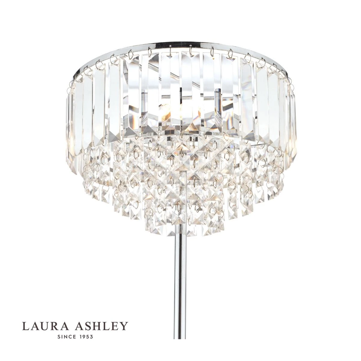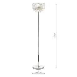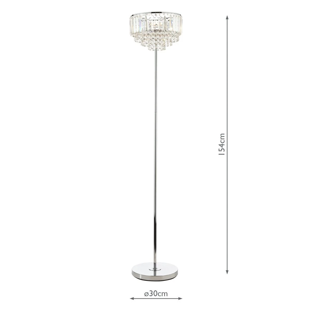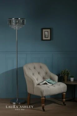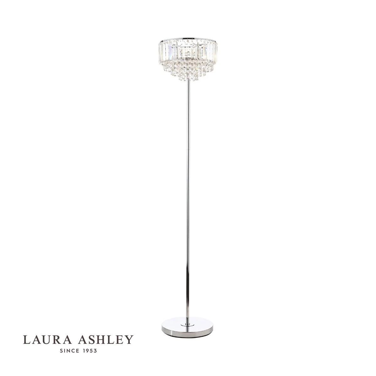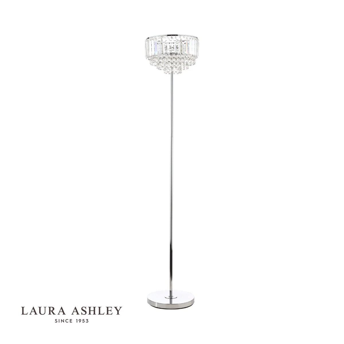 The glamorous Laura Ashley 3 light Vienna floor light features bevelled glass ‘coffin crystal’ rods with a glittering fountain of square-cut faceted glass droplets that fall to a central point, all suspended from a circular frame. The shade is supported on a straight stem rising up from a flat, round base. All the metalwork is finished in bright, polished chrome.