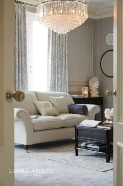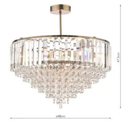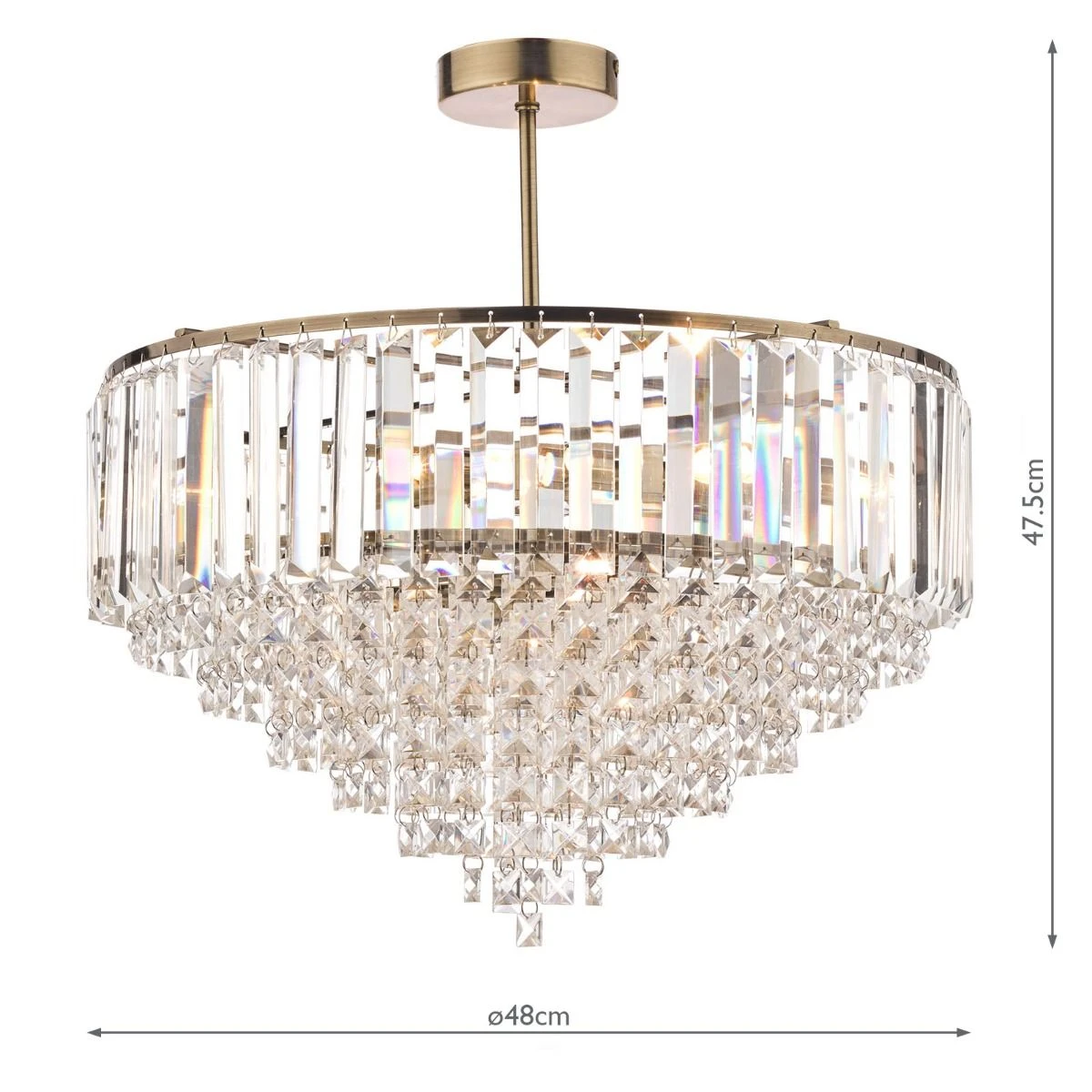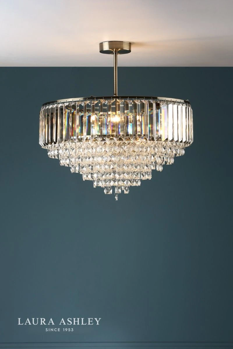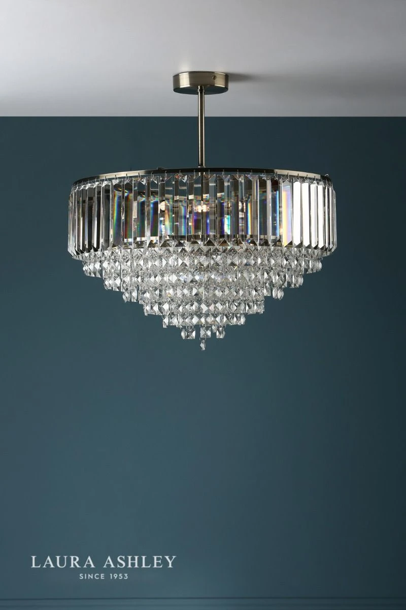 The glamorous Laura Ashley 5 light Vienna ceiling light features bevelled glass ‘coffin crystal’ rods with a glittering fountain of square-cut faceted glass droplets that fall to a central point, all suspended from a circular frame in a warm antique brass finish. Semi flush fittings are popular as they sit closer to the ceiling than a pendant so are suitable for lower ceilings and smaller rooms, plus they are more decorative and have a neater finish – there are no cables on show as the stem attaches directly to the ceiling rose.