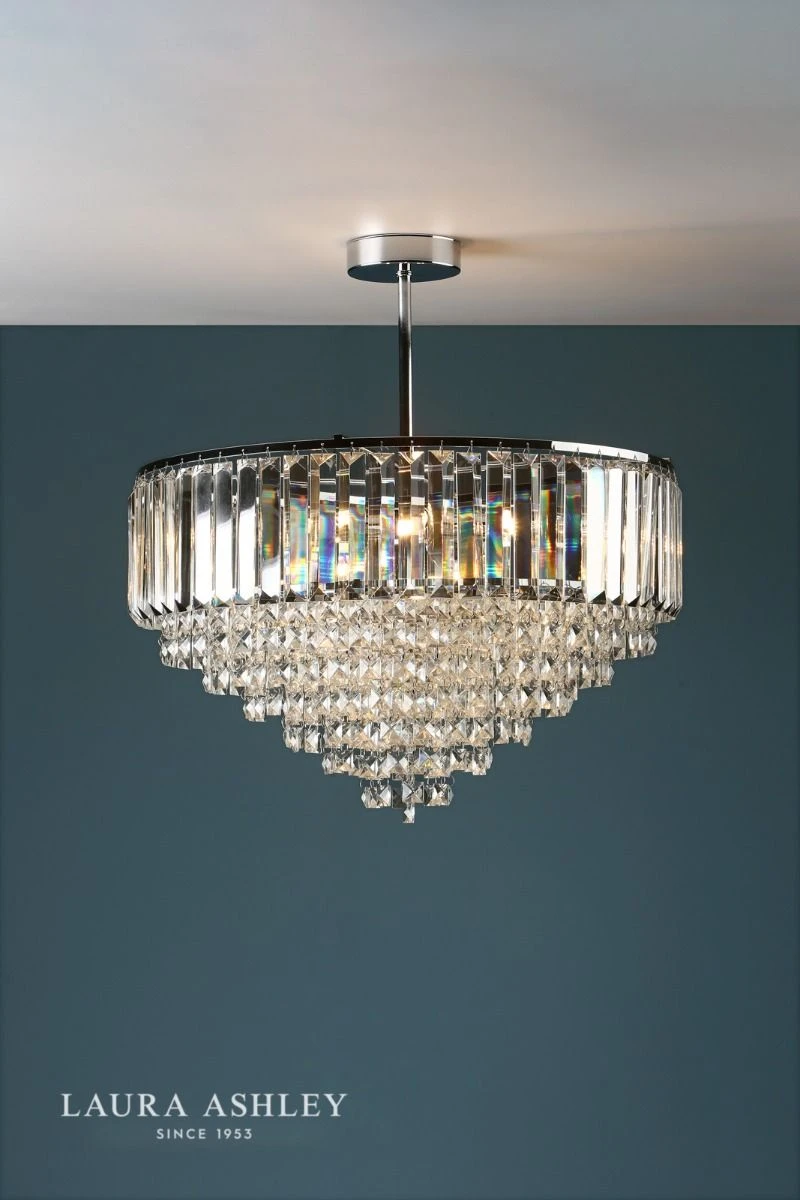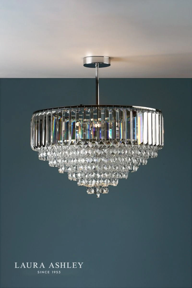 The glamorous Laura Ashley 5 light Vienna ceiling light features bevelled glass ‘coffin crystal’ rods with a glittering fountain of square-cut faceted glass droplets that fall to a central point, all suspended from a circular frame in a bright, polished chrome finish. Semi flush fittings are popular as they sit closer to the ceiling than a pendant so are suitable for lower ceilings and smaller rooms, plus they are more decorative and have a neater finish – there are no cables on show as the stem attaches directly to the ceiling rose.