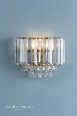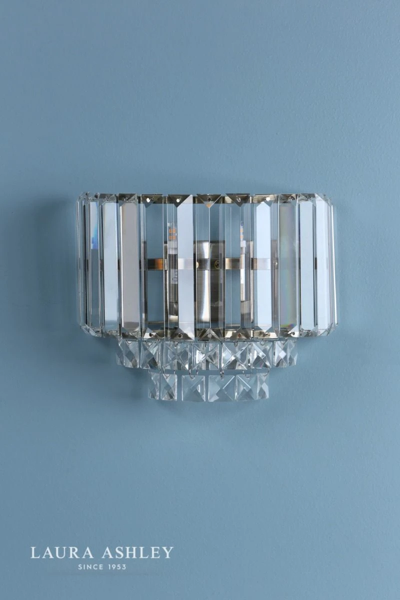 The glamorous Laura Ashley Vienna single wall light features bevelled glass ‘coffin crystal’ rods with a glittering fountain of square-cut faceted glass droplets that fall to a central point, all suspended from a circular frame in a warm antique brass finish.