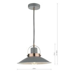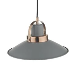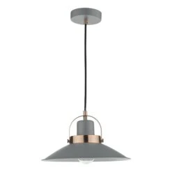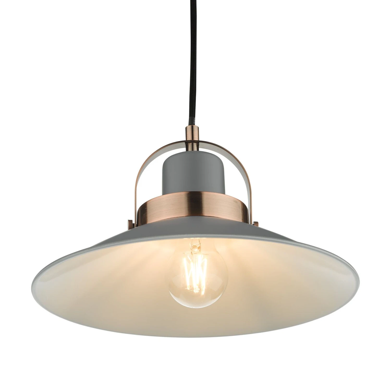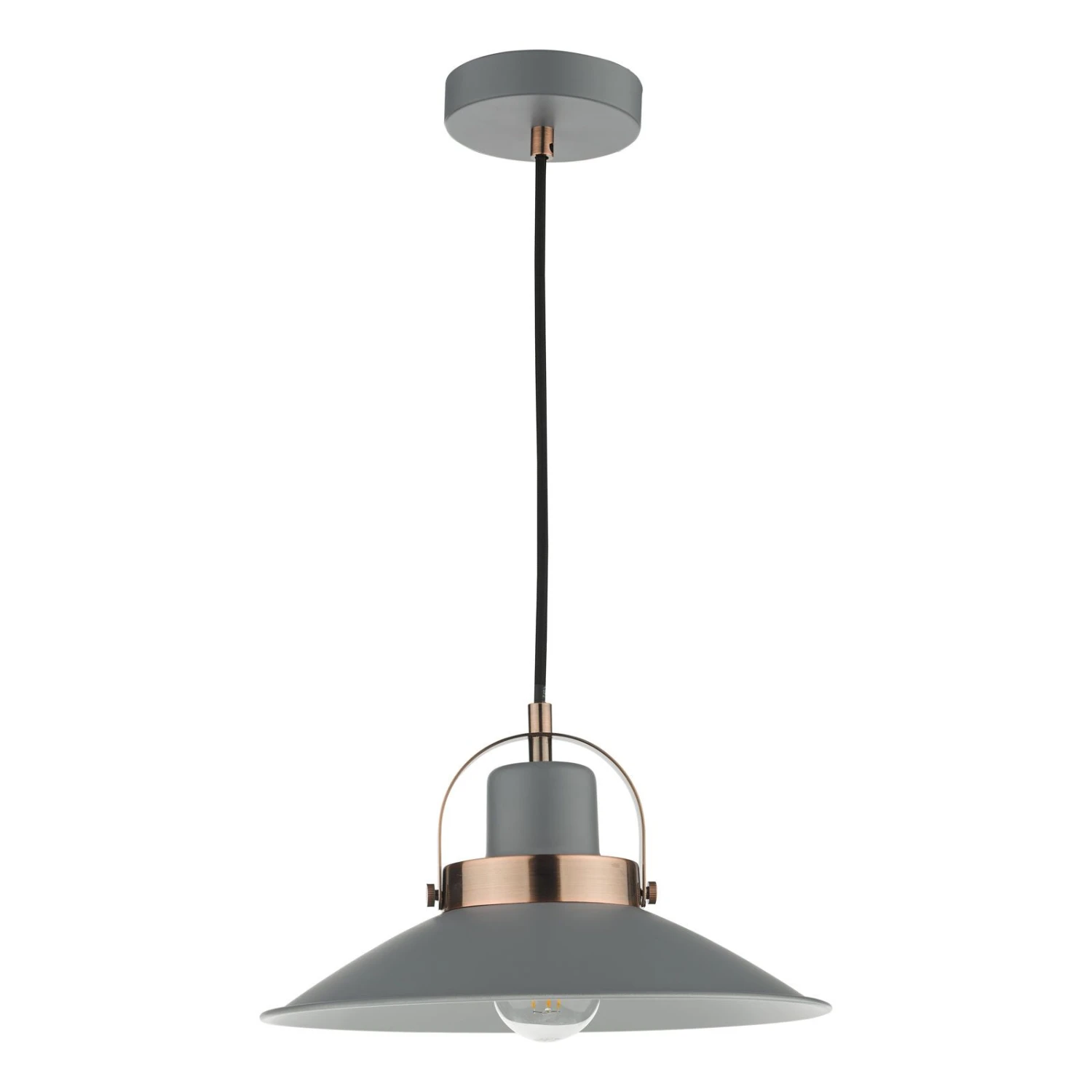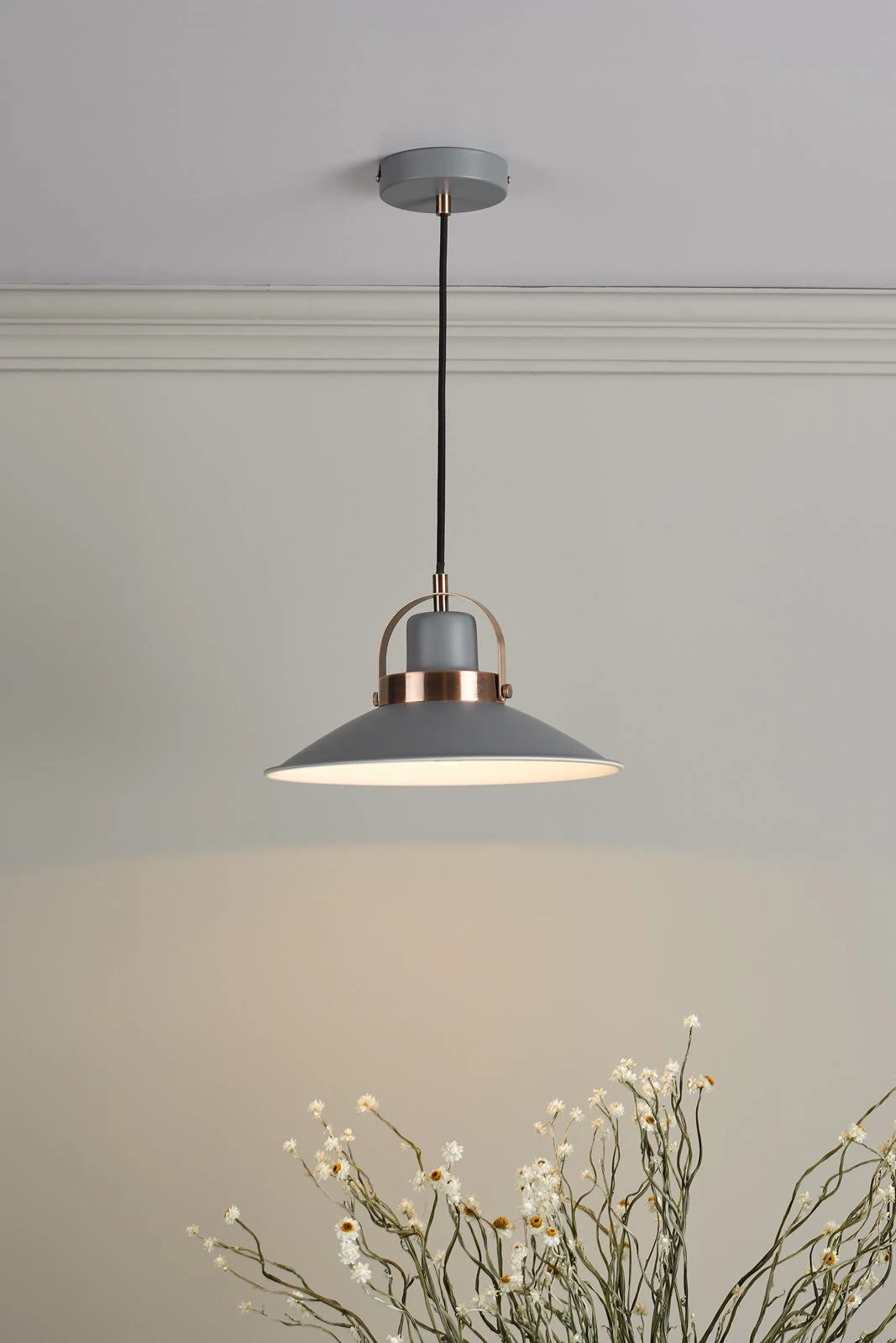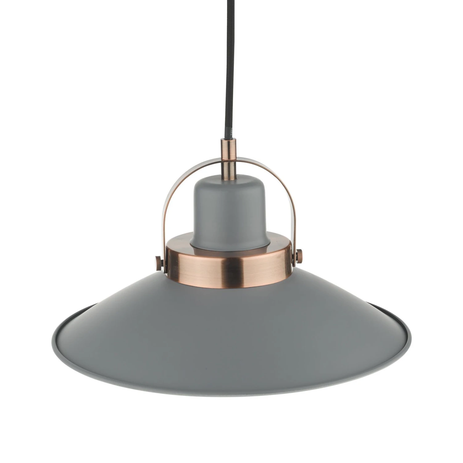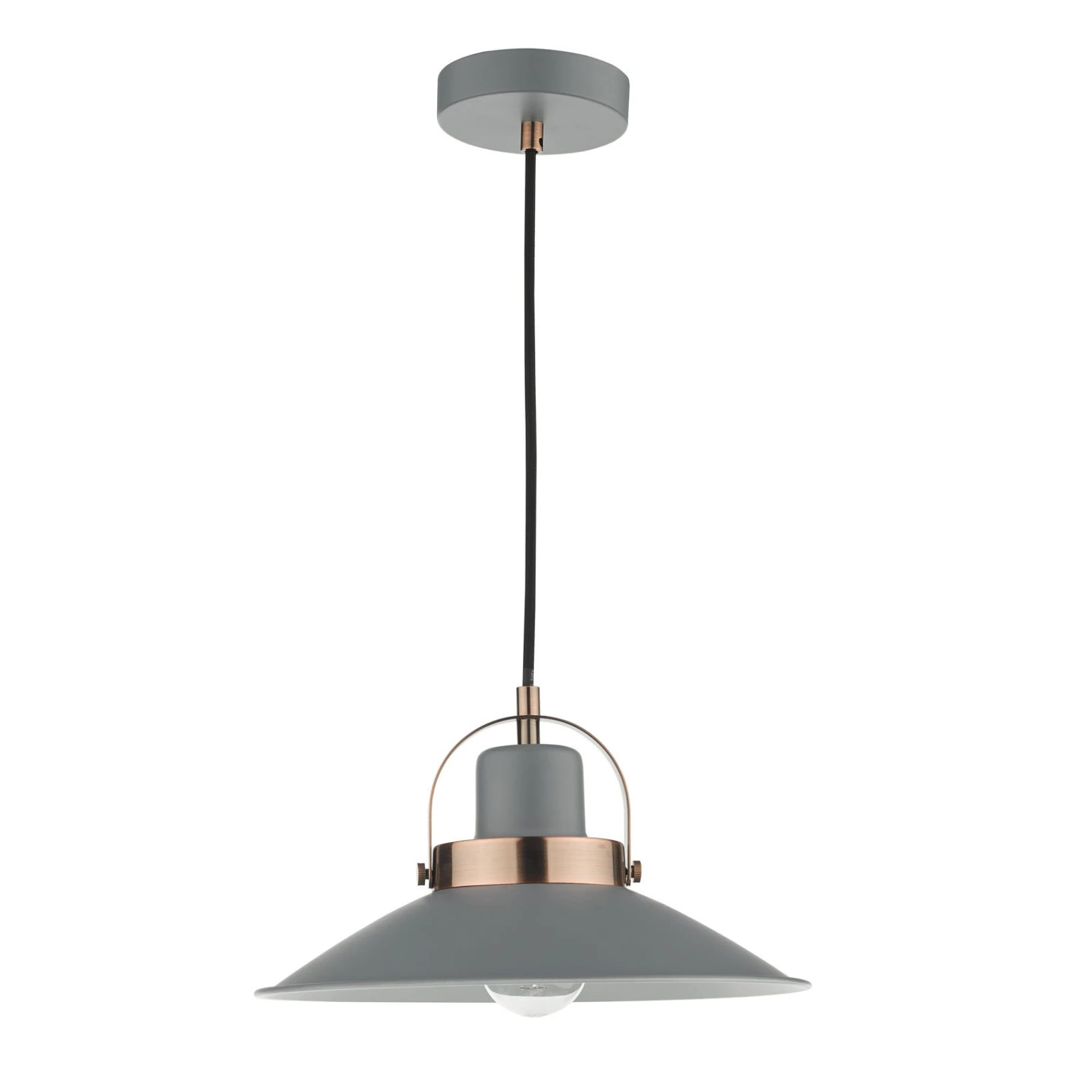 The Liden single pendant features an angular matt grey painted metal shade with copper detailing and matching ceiling plate, offering a more contemporary industrial look.