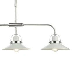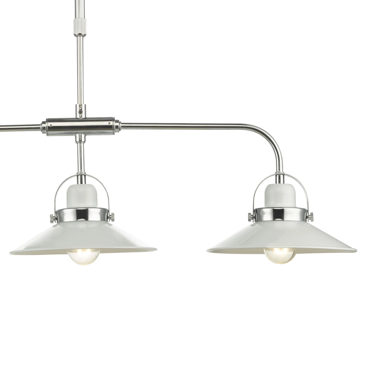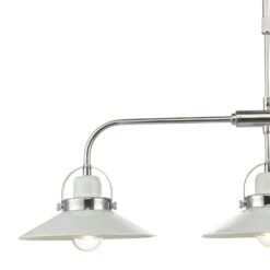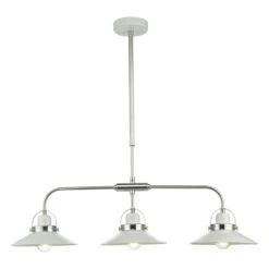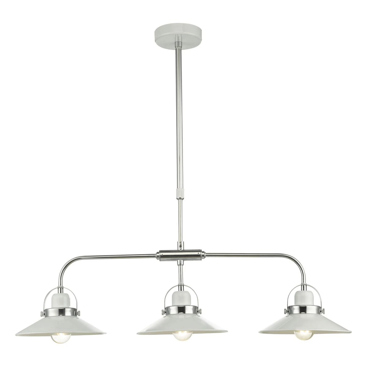 White gloss shades and chrome detailing offer a clean stripped down softer industrial look. This three light bar pendant features a telescopic stem for height adjustment on installation. Perfect for use over a breakfast bar or table. Also available as a single wall light, single pendant.