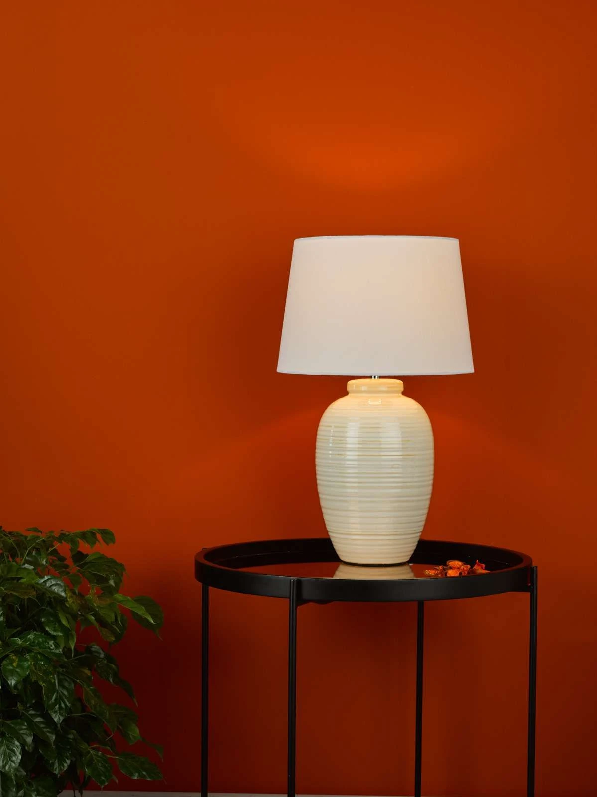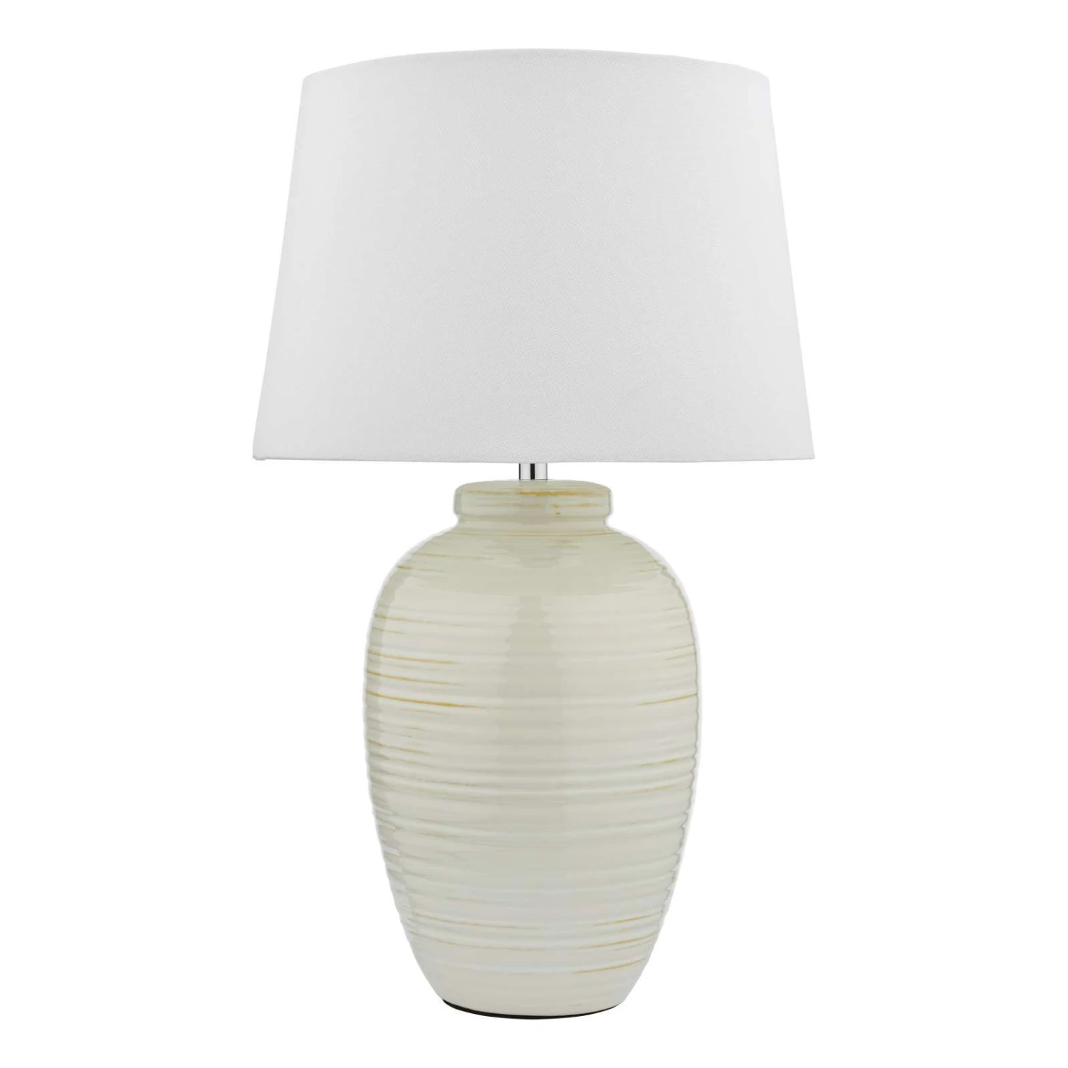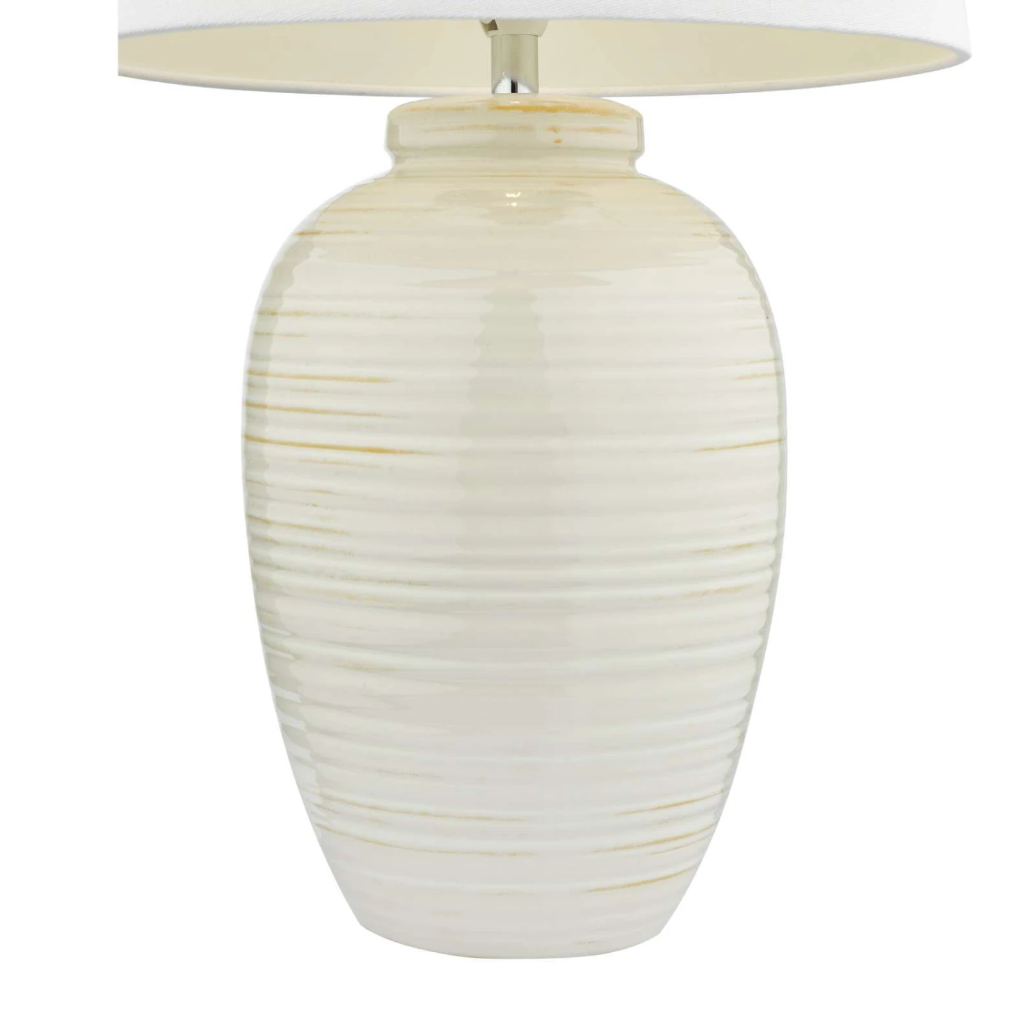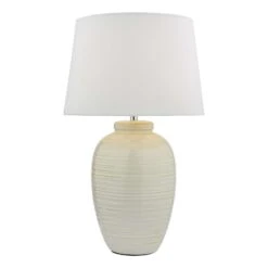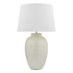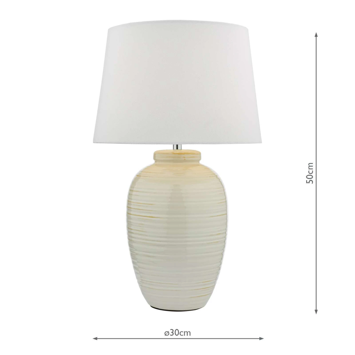 The Luelle Ivory table lamp features a traditional ‘as thrown’ finish with the rings created by the throwers thumbs, this is further accentuated by the reactive ivory glaze which allows some of the bare porcelain to show through. A tapered white linen drum shade completes the look.
